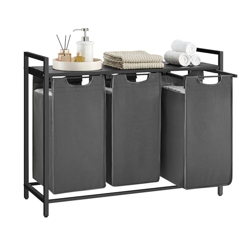VASAGLE Laundry Basket, 3-Compartment Laundry Hamper, Pull-Out and Removable Liner Bags, Clothes Sorter, Shelf, Metal Frame, 3 x 40 L, 92.5 x 33 x 72 cm, Slate Grey and Charcoal Grey BLH301G01