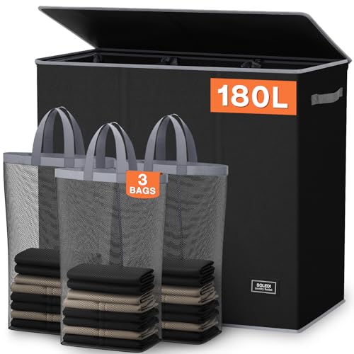 SOLEDI Laundry Hamper 3 section with lid and 3 Pcs Laundry Bag, Large Hamper 3 compartment 180L, Laundry Basket Laundry sorter Clothes hamper for Laundryroom Bedroom Blanket Storage Organizer-Black
