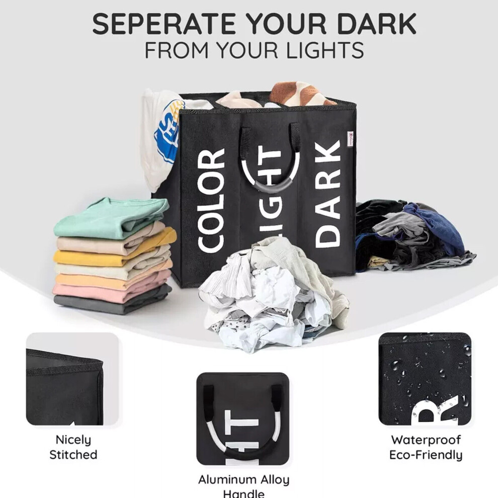 Black 3 Compartment Laundry Bag Large Clothes Washing Basket Hamper