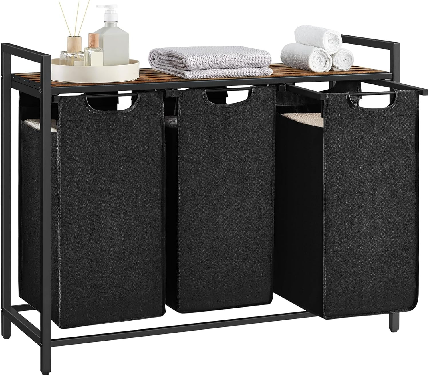 VASAGLE Laundry Basket, 3-Compartment Laundry Hamper, Pull-Out and Removable Liner Bags, Clothes Sorter, Shelf, Metal Frame, 3 x 40 L, 92.5 x 33 x 72 cm, Ink Black and Rustic Brown BLH301B01