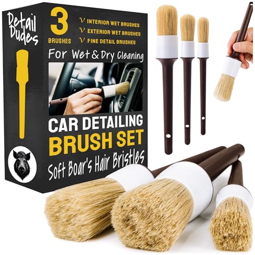 Ultra Soft Natural Boars Hair Bristle Car Detail Brushes - Set of 3 - Perfect for Washing Emblems Wheels Interior Upholstery Air Vents, No Metal Parts