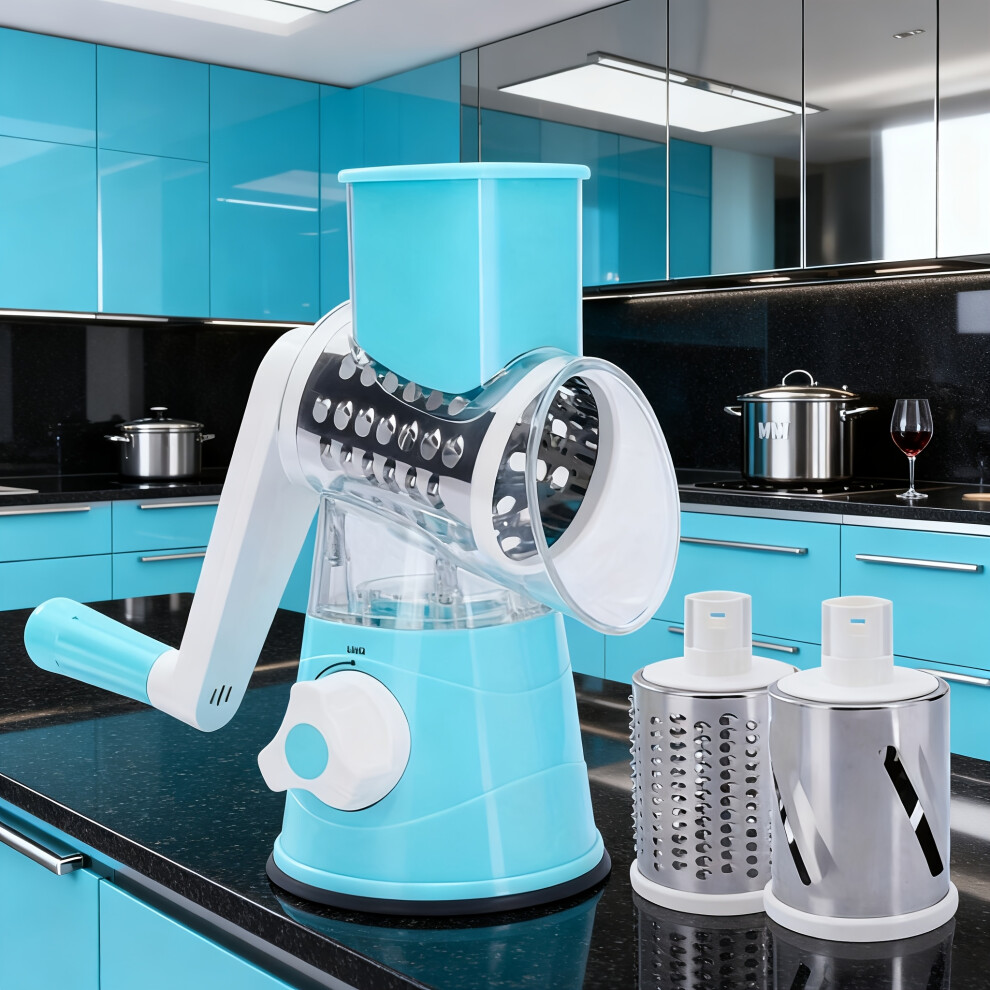 (3 In 1 Vegetable Cutter-blue) New Storm Manual Food Processor with Rotary Drum & Multi-Blade System - Heavy-Duty Metal Vegetable Chopper
