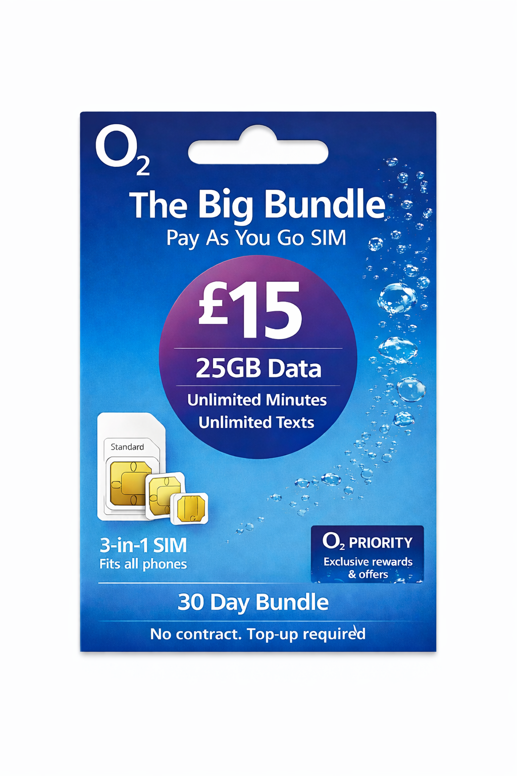 O2 Bundles (3in1 SIM Card) PAY AS YOU GO SIM CARD- 15 Bundle Pack- BRAND NEW
