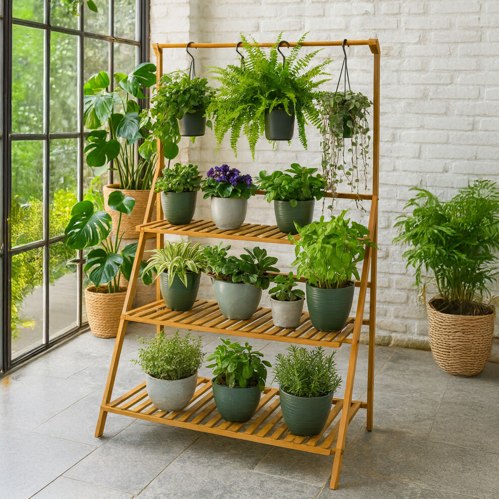 Neo 3 Tier Foldable Bamboo Plant Stand with Hanging Hook Indoor & Outdoor Flower Ladder for Balcony Living Room & Garden