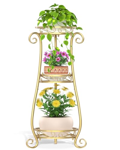 VASZOLA 3 Tier Gold Metal Plant Stand for Multiple Large Planters Indoor Outdoor Organizer, Heavy Duty Tall Flower Stand for Corner Patio Bathroom Office, Modern Sturdy Vertical Iron Rack, Cat Proof
