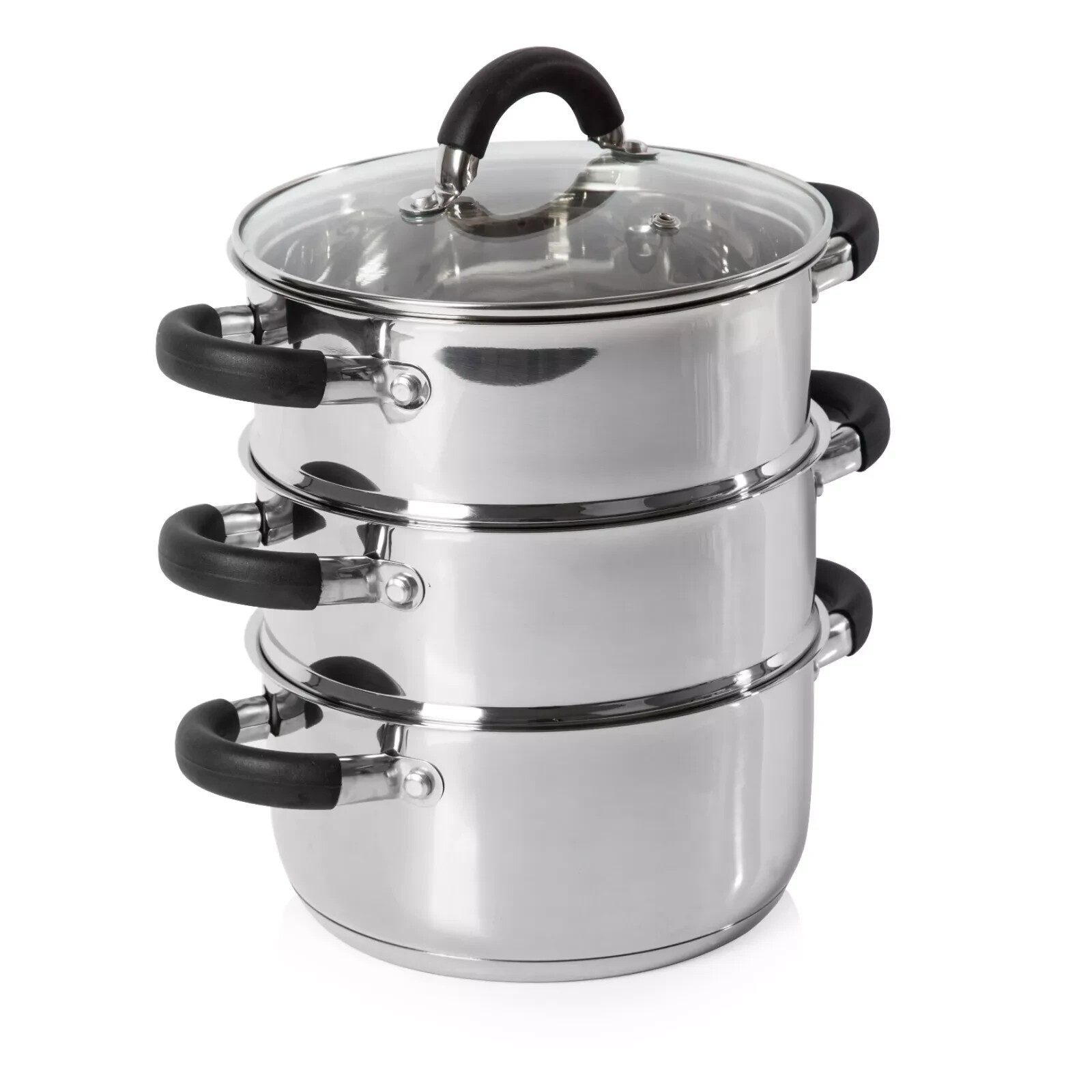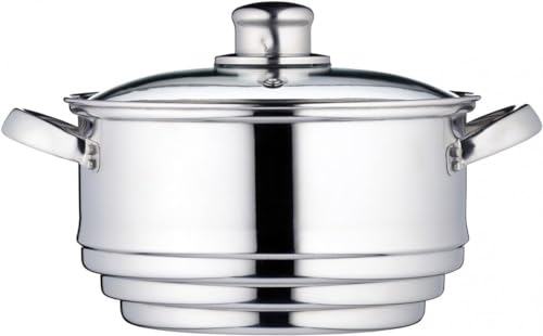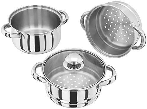Buckingham 3 Tier Premier Steamer Set with Glass Lid Polished Mirror Finish Stainless Steel Ideal for Steamer Cooking Induction Compatible 18 Cm, Silver