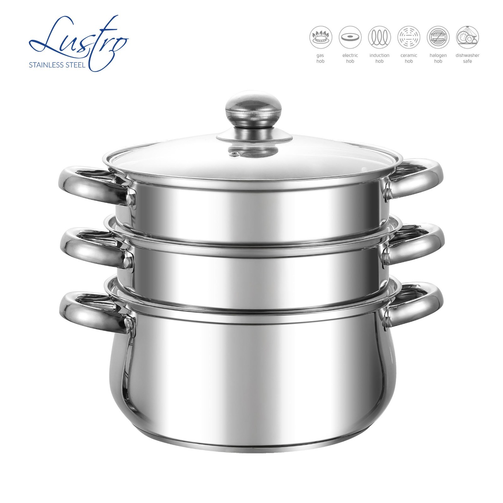 Buckingham 3 Tier Premier Steamer Set with Glass Lid Polished Mirror Finish Stainless Steel Ideal for Steamer Cooking Induction Compatible, Silver