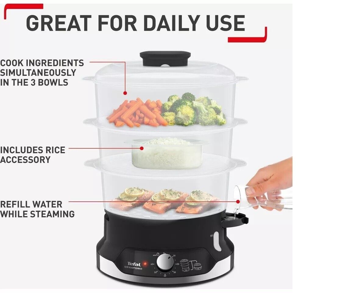 TEFAL Compact 3 Tier Food Vegetable Steamer 60 Min Timer BPA Free Bowls VC204865