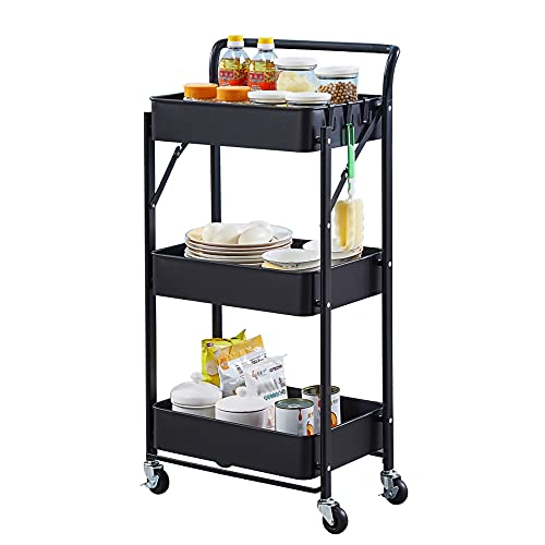 LRBBH 3-Tier Storage Trolley Cart, Free Standing Shelf Organization, Foldable Storage Shelves with Wheel for Kitchen, Home, Bedroom,Black
