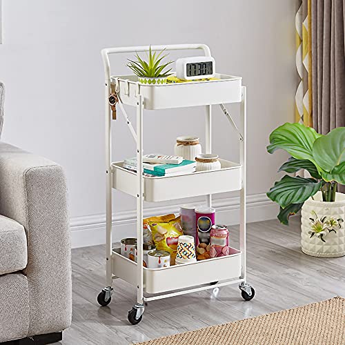 NTEK White 3 Tier Foldable Storage Trolley Cart | Foldable Rolling Carts | Trolley with Locking Wheels