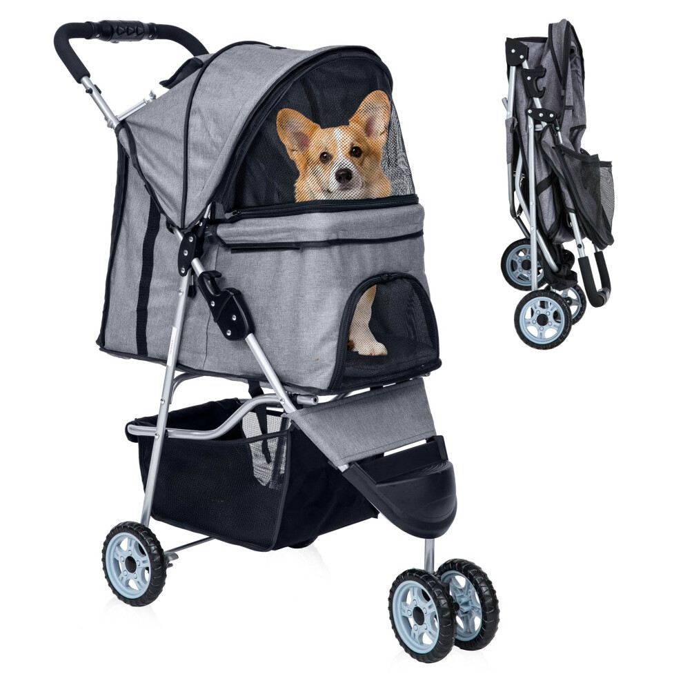 Foldable 3-Wheel Pet Stroller for Small/Medium Dogs & Cats â Grey, with Storage Basket, Cup Holder, Lightweight; Compatible with Travel