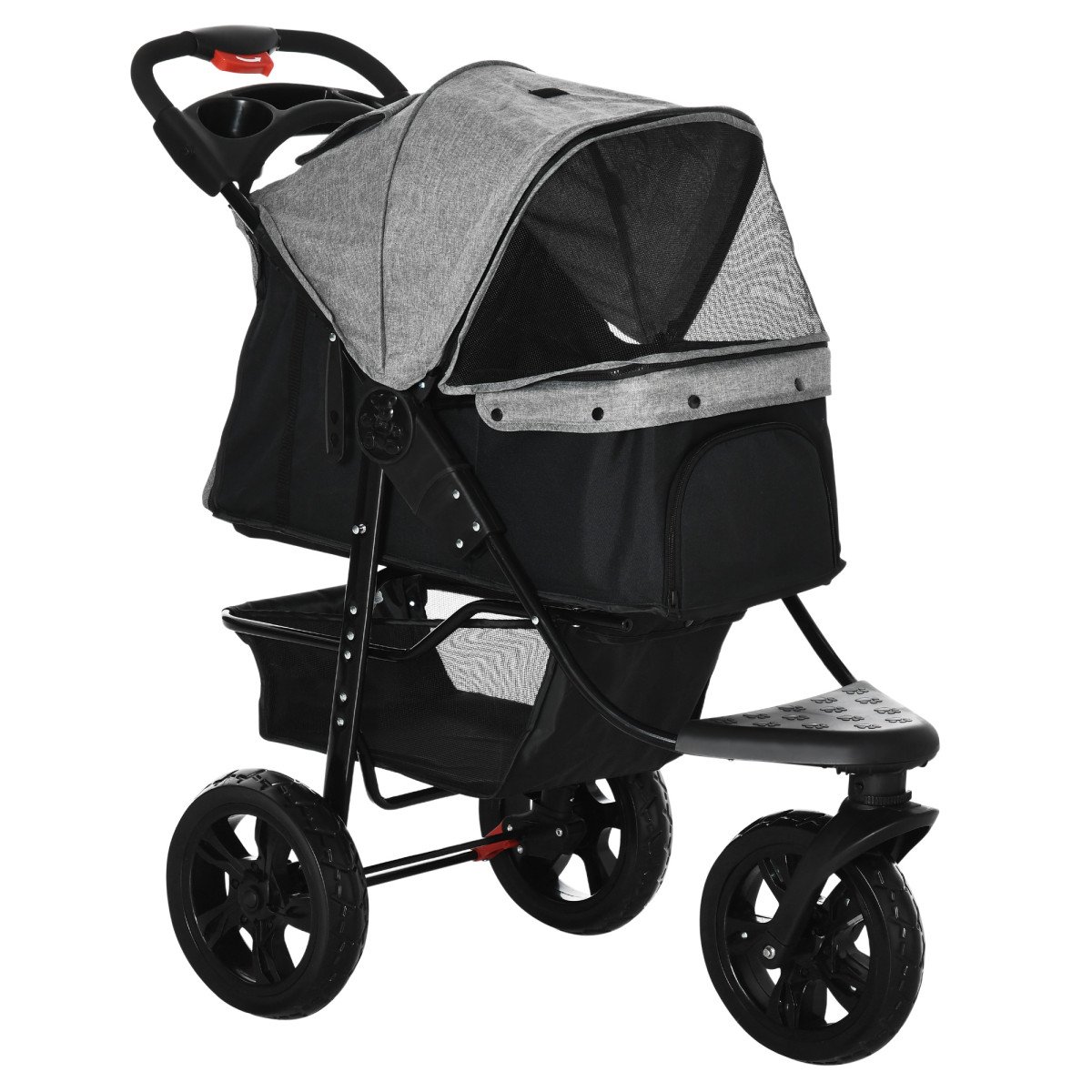 Pawhut Dog Pushchair Folding Pet Stroller 3 Wheel Dog Jogger Travel Carrier Adjustable Canopy Storage Brake Mesh Window Grey