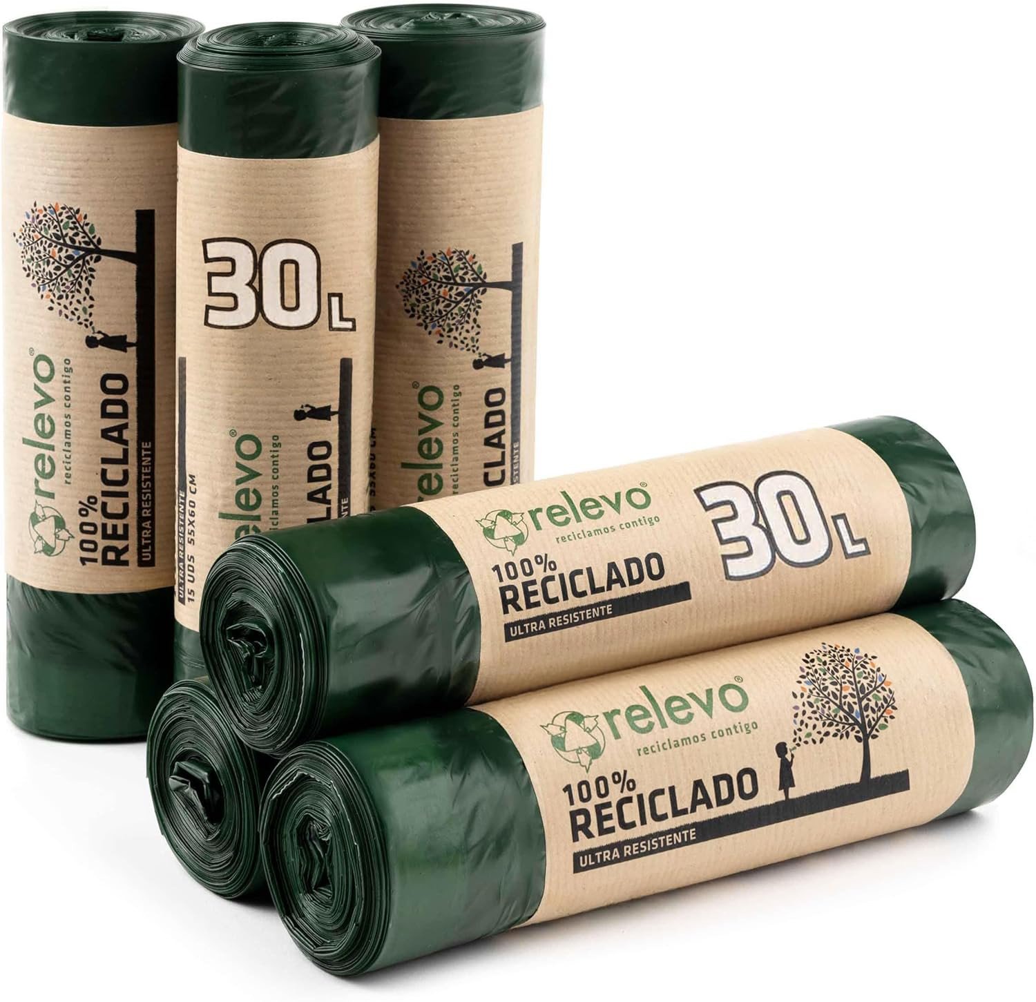 Relevo 30 Litre Bin Bags – Made from 100% Recycled Material. Green Bin Bags 30L – 55 cm x 60 cm. Includes 90 units of 30L Bin Liners with Drawstrings.