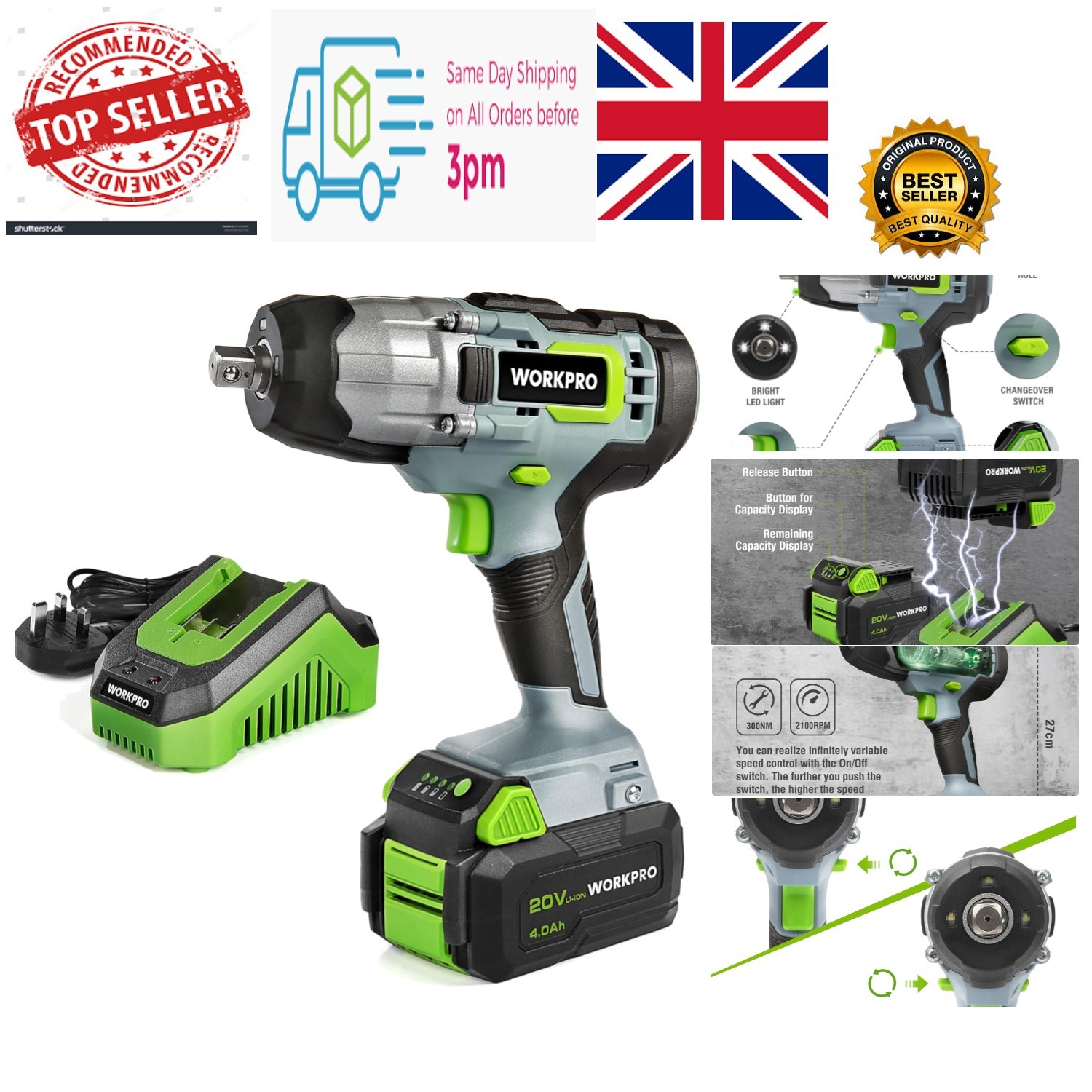 WorkPro 20V Cordless Impact Wrench - 1/2 Inch, 300Nm Max Torque, 4.0Ah Li-Ion Battery & Fast Charger Included