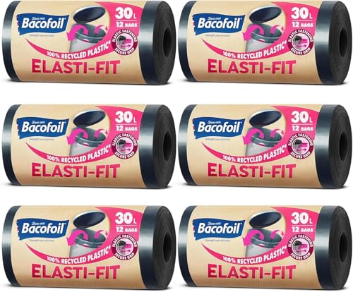 Bacofoil Elasti-Fit Bin Liners - 30L Recycled bin bags, 6 Rolls (72 Bags) - Leak-Proof, Elastic Fastening for Secure Fit - Made from 100% Recycled Plastic - Eco-Friendly Waste Disposal.