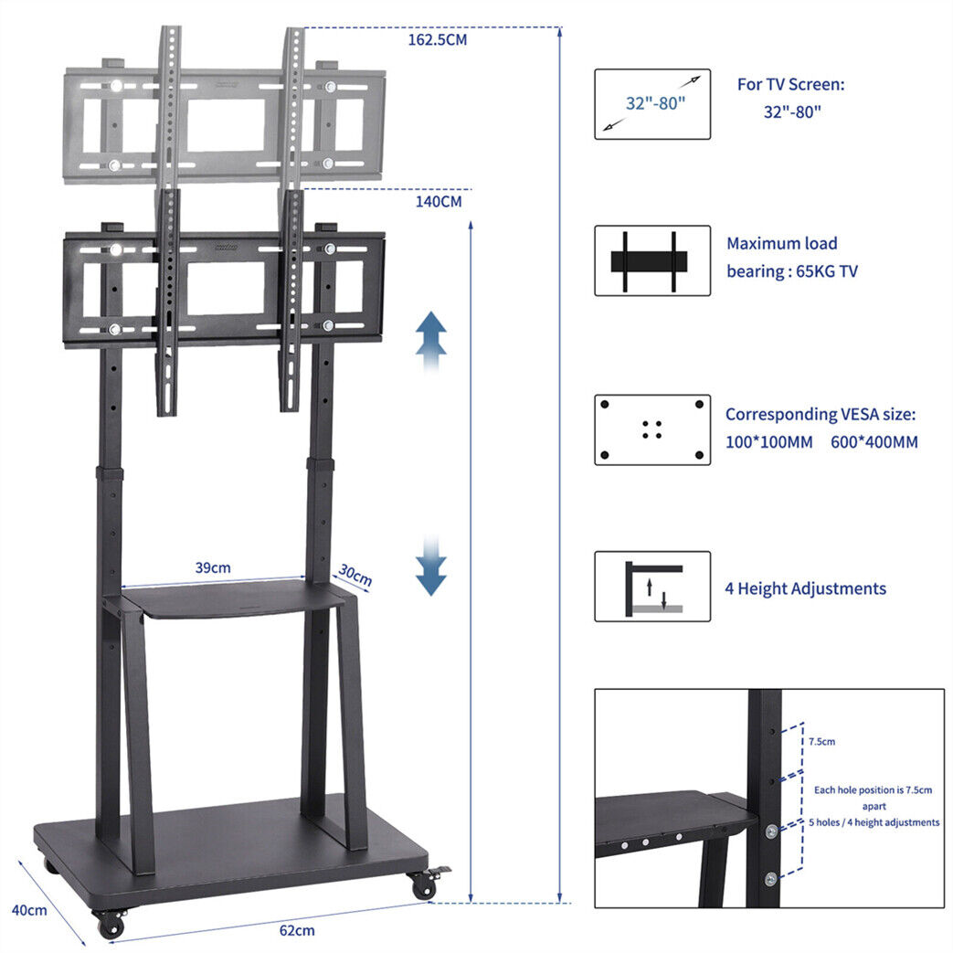 Universal 32"-100" Floor TV Stand Mobile TV Cart Mount Max Hold 80KG Easy Moving