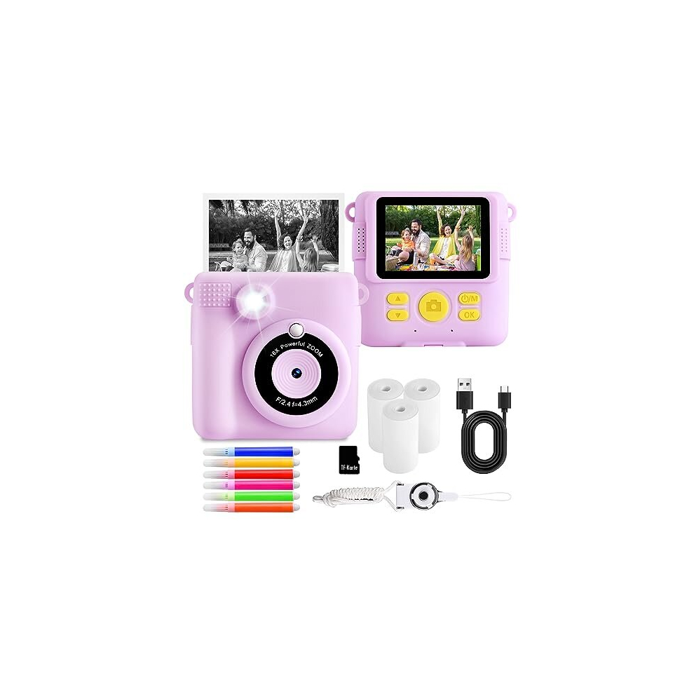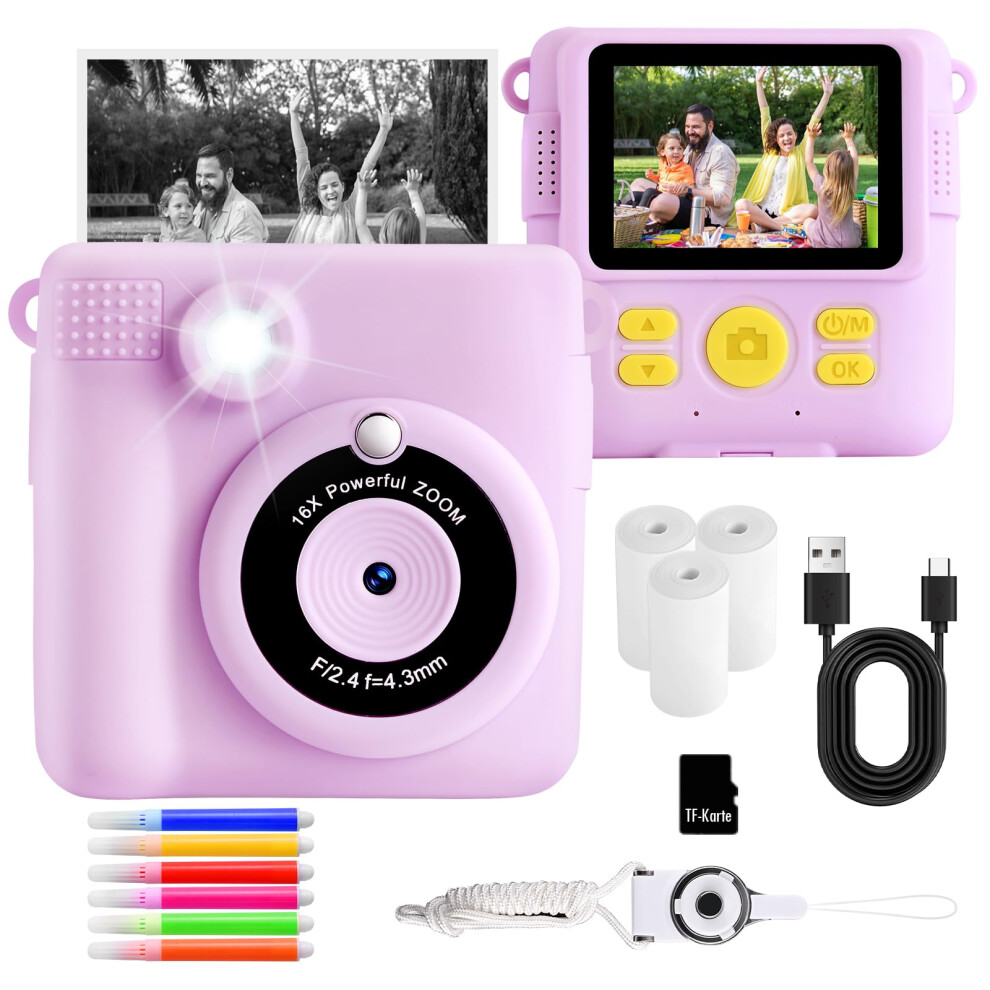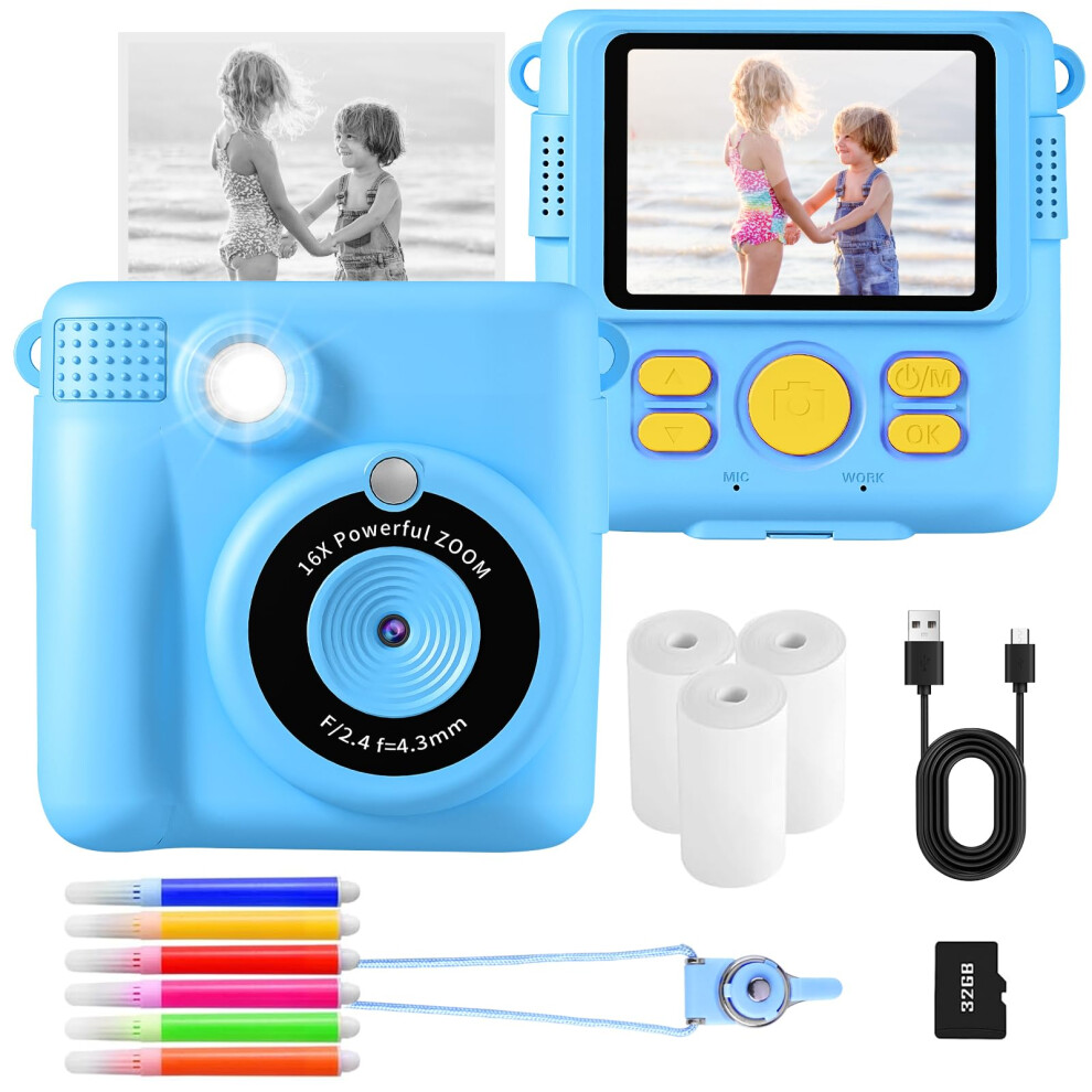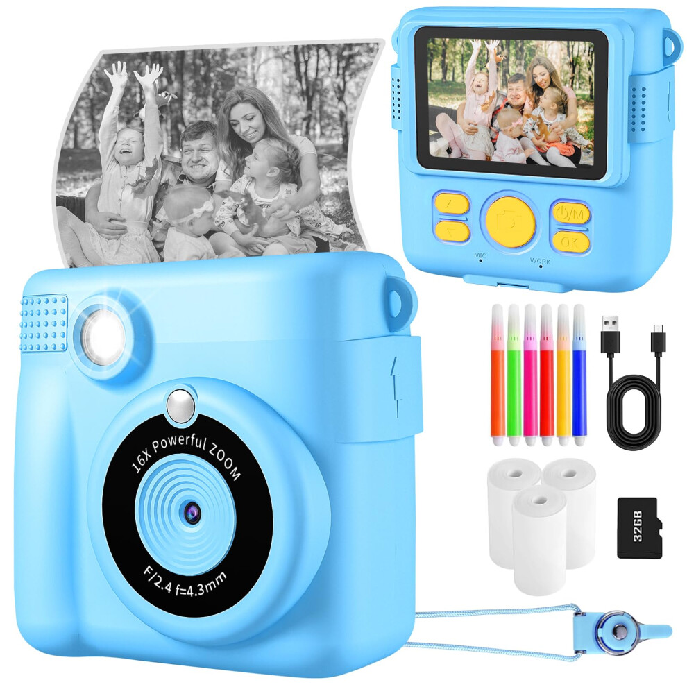 Dhapy Kids Camera Instant Print, 1080P HD Instant Camera, 16x Digital Zoom Kids Camera with Print Paper & DIY Color Pens & 32G SD Card, Birthday Toys