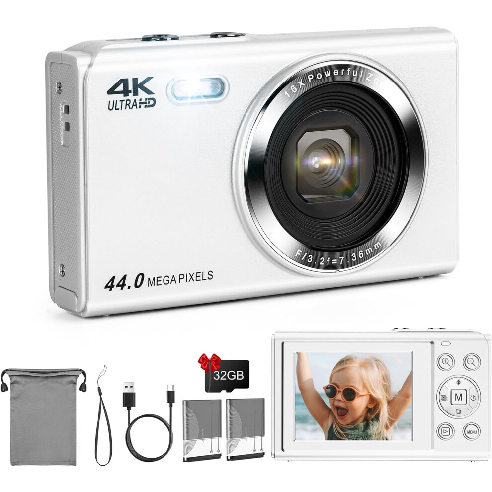 (White) Digital Camera, FHD 1080P 44MP Compact Camera,Vlogging Camera with 32G SD Card, 2.4" LCD Screen Rechargeable Camera with 16X Digital Zoom