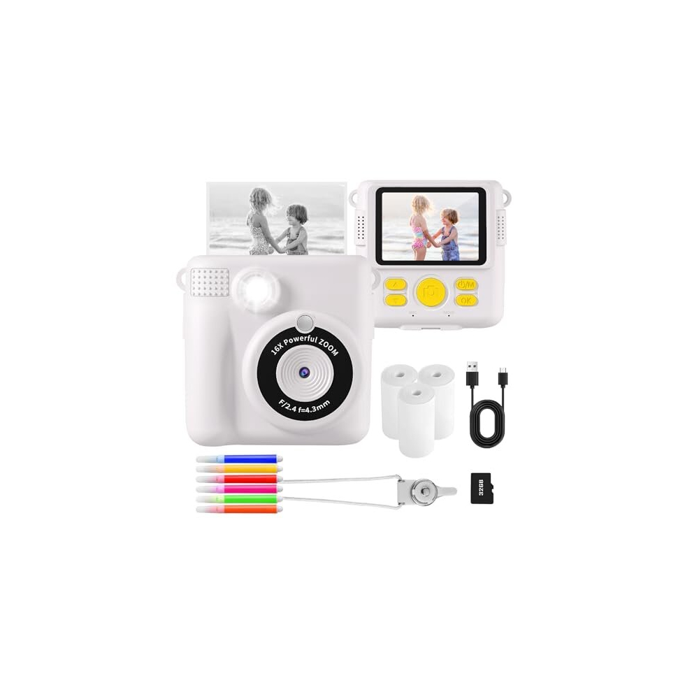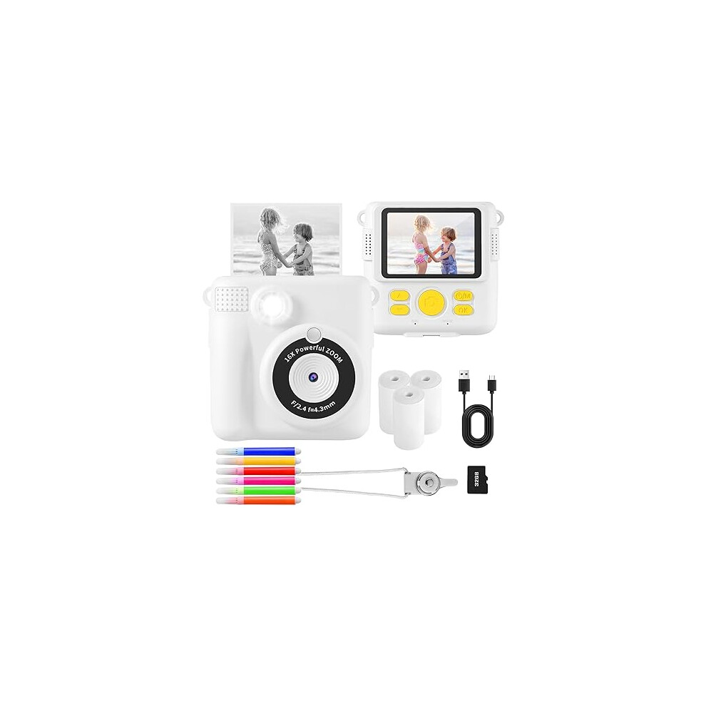 Kids Camera,Instant Print Camera for Kids,1080P HD Digital Camera with 32G SD Card,3 Rolls Photo Paper & 6 Color Pens, for 3-14 Year Old Girls (White)