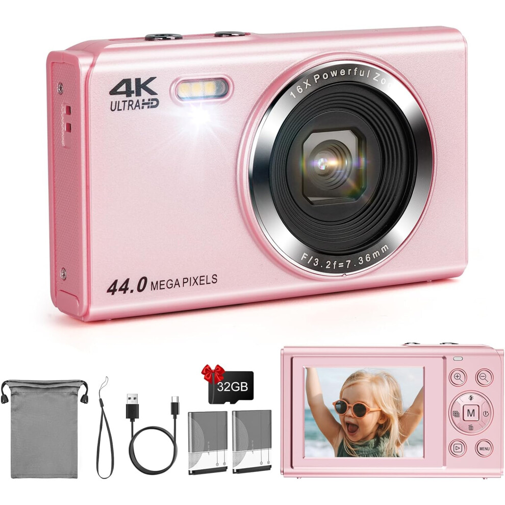(Pink) Digital Camera, FHD 1080P 44MP Compact Camera,Vlogging Camera with 32G SD Card, 2.4" LCD Screen Rechargeable Camera with 16X Digital Zoom