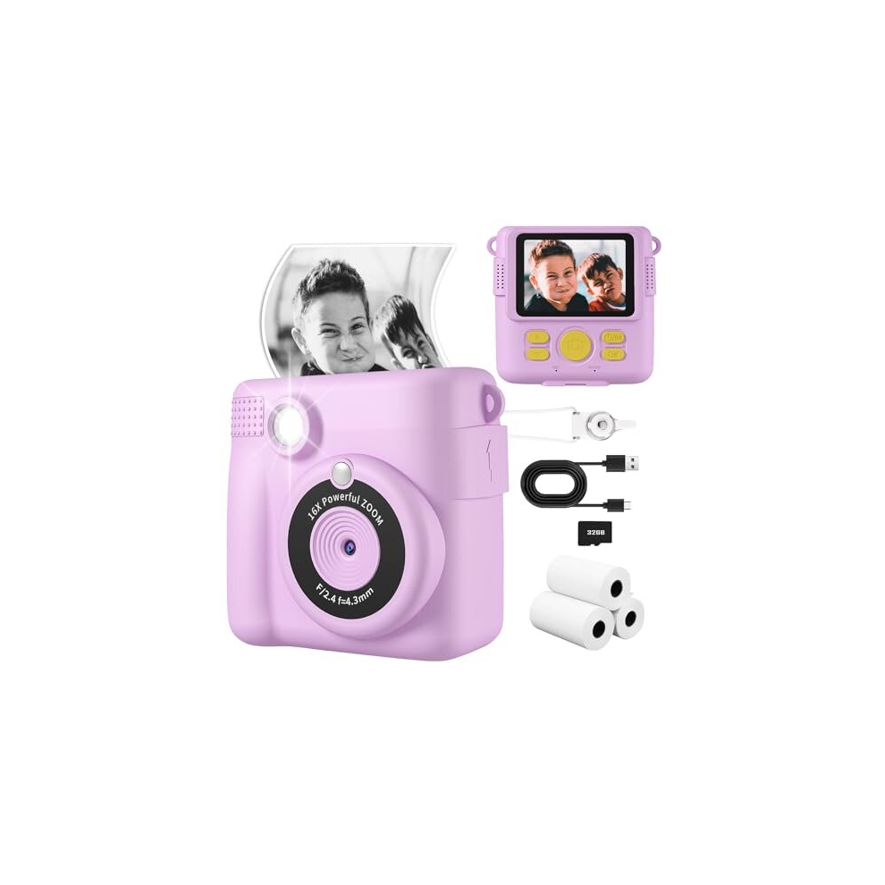 Kids Camera,Instant Print Camera for Kids,1080P HD Digital Camera with 32G SD Card,3 Rolls Photo Paper & 6 Color Pens, for 3-14 Year Old Girls (Purple