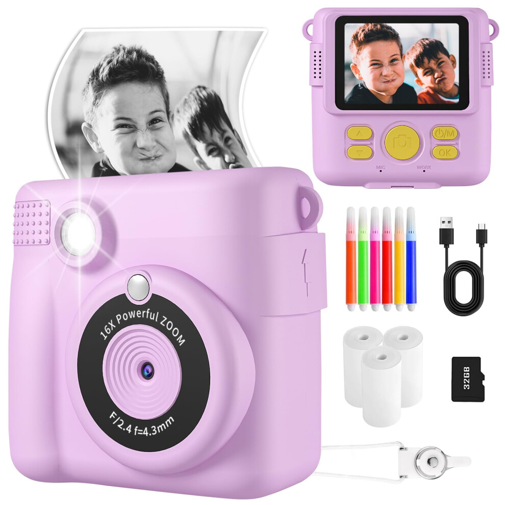 Kids Instant Print Camera, 1080P HD Digital Camera with 32G SD Card, 3 Rolls Photo Paper & 6 Color Pens, for 3-14 Year Old Girls (Purple)