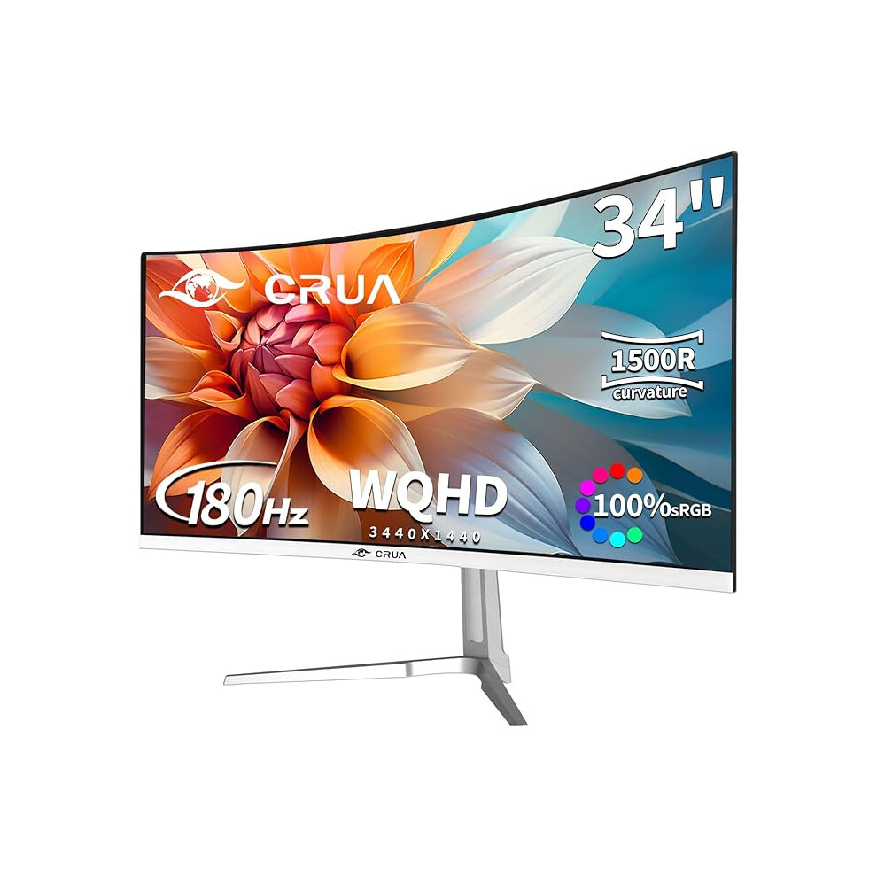 CRUA 34 Inch Ultrawide WQHD Gaming Monitor 180Hz, 3440x1440 Curved Display, White Ultra Slim Design, 1ms MPRT, FreeSync & G-SYNC Compatible, HDR, HDMI & DisplayPort, VESA Mountable PC Monitor