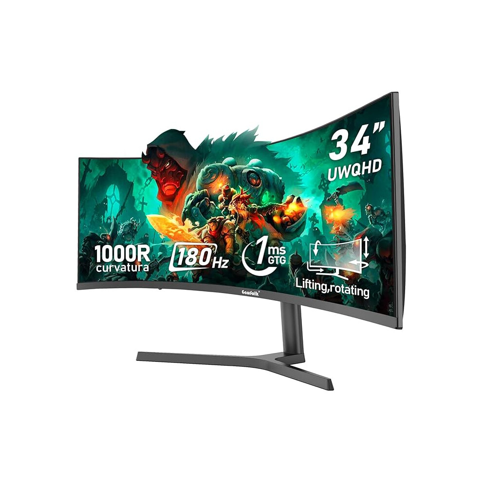 Gawfolk 34 Inch Ultrawide Curved 180Hz Gaming Computer Monitors 1000R PC screen 21:9 UWQHD (3440x1440) ,1ms,100%sRGB,Adaptive Sync,HDMI、Display Port,Liftable,Compatible with wall mounted 75*75mm-Black