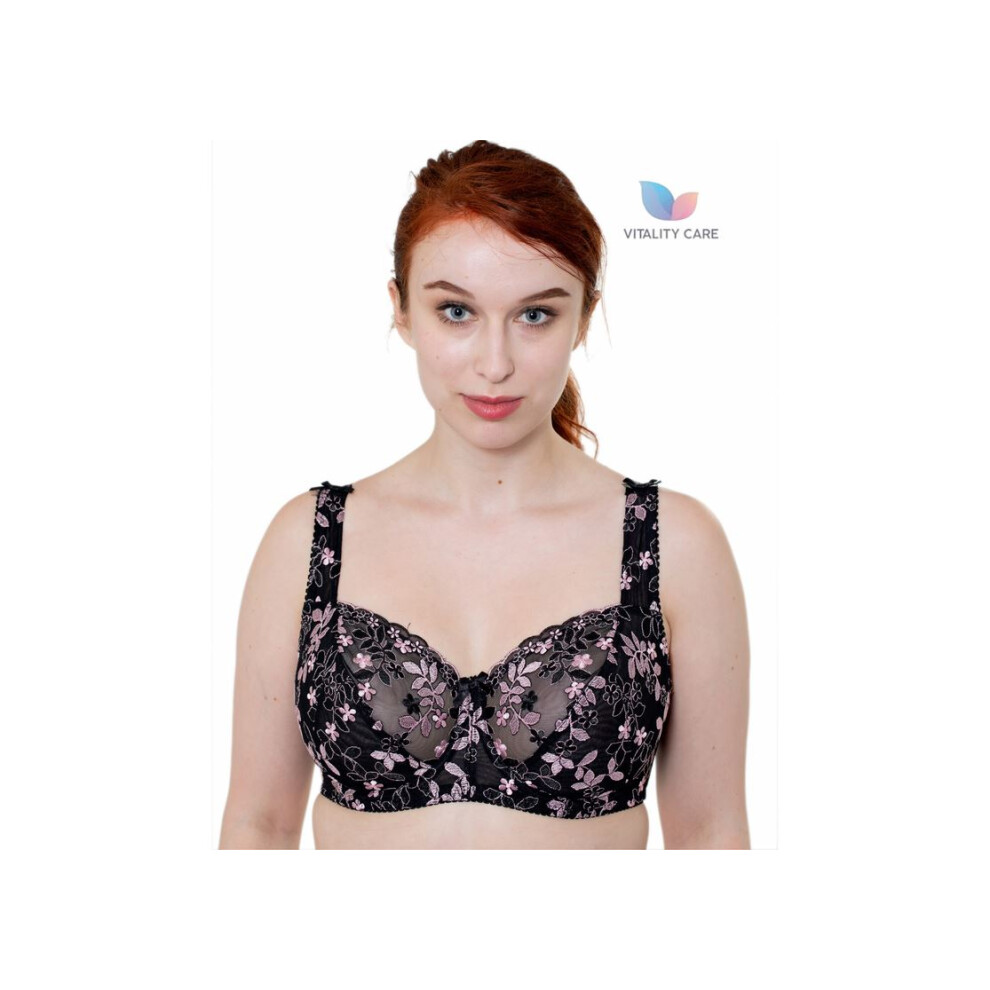(38, DD) Vitality Care Ladies Full Coverage Floral Embroidered Lace Underwired Non-Padded Bra for Plus Size and Large Busts Black Pink