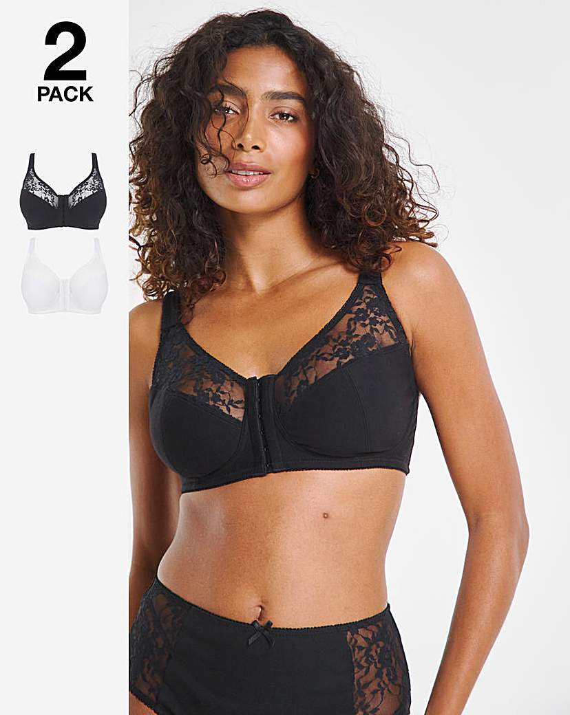 2 Pack Sarah Front Fasten Non Wired Bras White/Black - Pretty Secrets - Size: 38DD