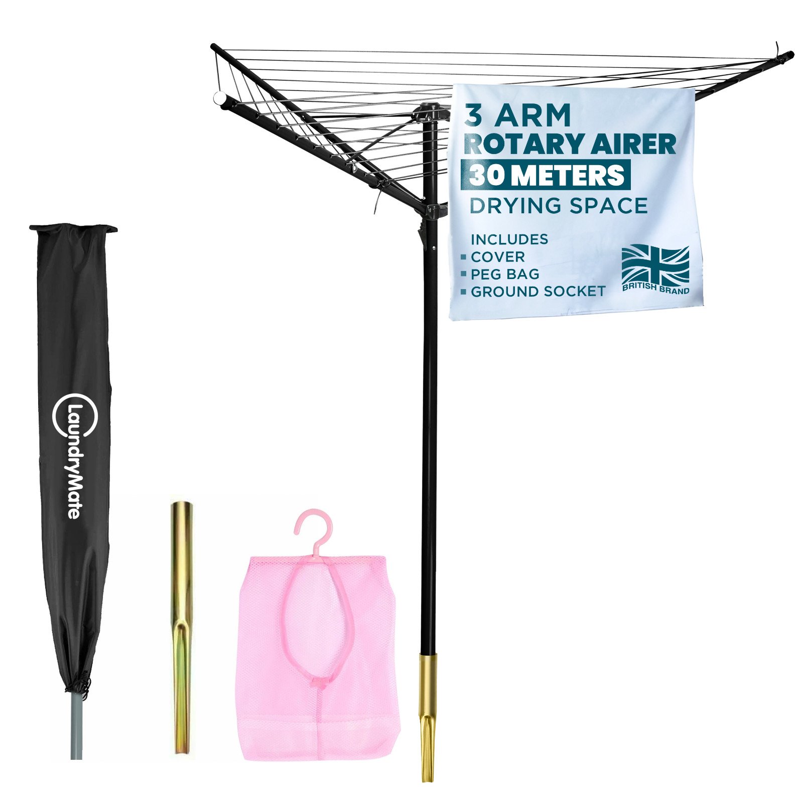 Rotary Airer 3 ARM 30M Clothes Garden Washing Line Ground Socket Cover & Peg Bag