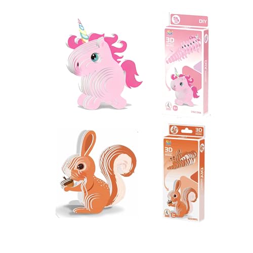 SiumPklay Peel & Stick 3D Puzzle Animal Kits: Squirrel & Unicorn with Snap-Fit & Pre-Applied Adhesive | Instant Assembly Eco Cardboard Models, STEM Toys for Kids Ages 6+ (2-Pack)