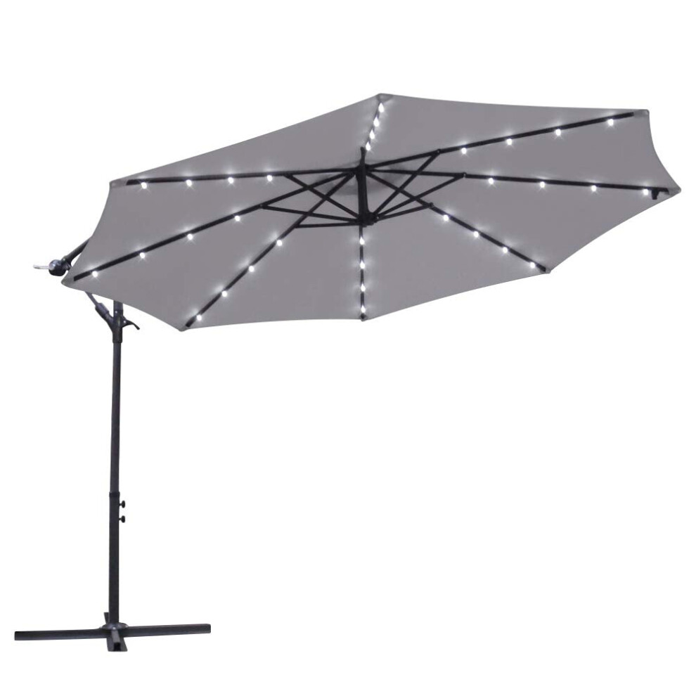 Outsunny 3(m) Cantilever Banana Parasol Hanging Umbrella with Double Roof, LED Solar lights, Crank, 8 Sturdy Ribs and Cross Base for Outdoor, Garden, Patio, Grey