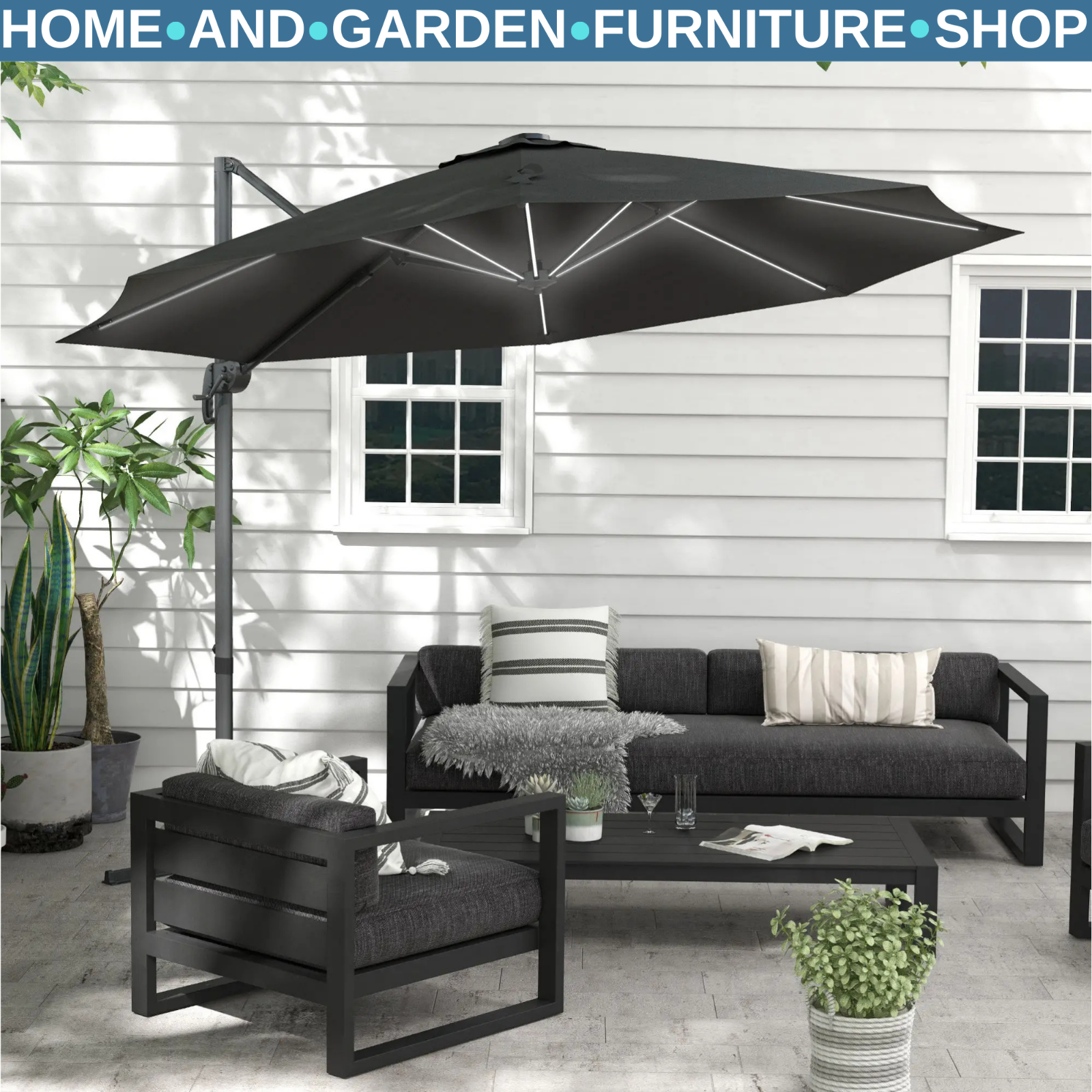 3m Adjustable Cantilever Parasol with Base and Solar LED Lights Garden Umbrella