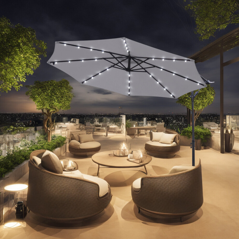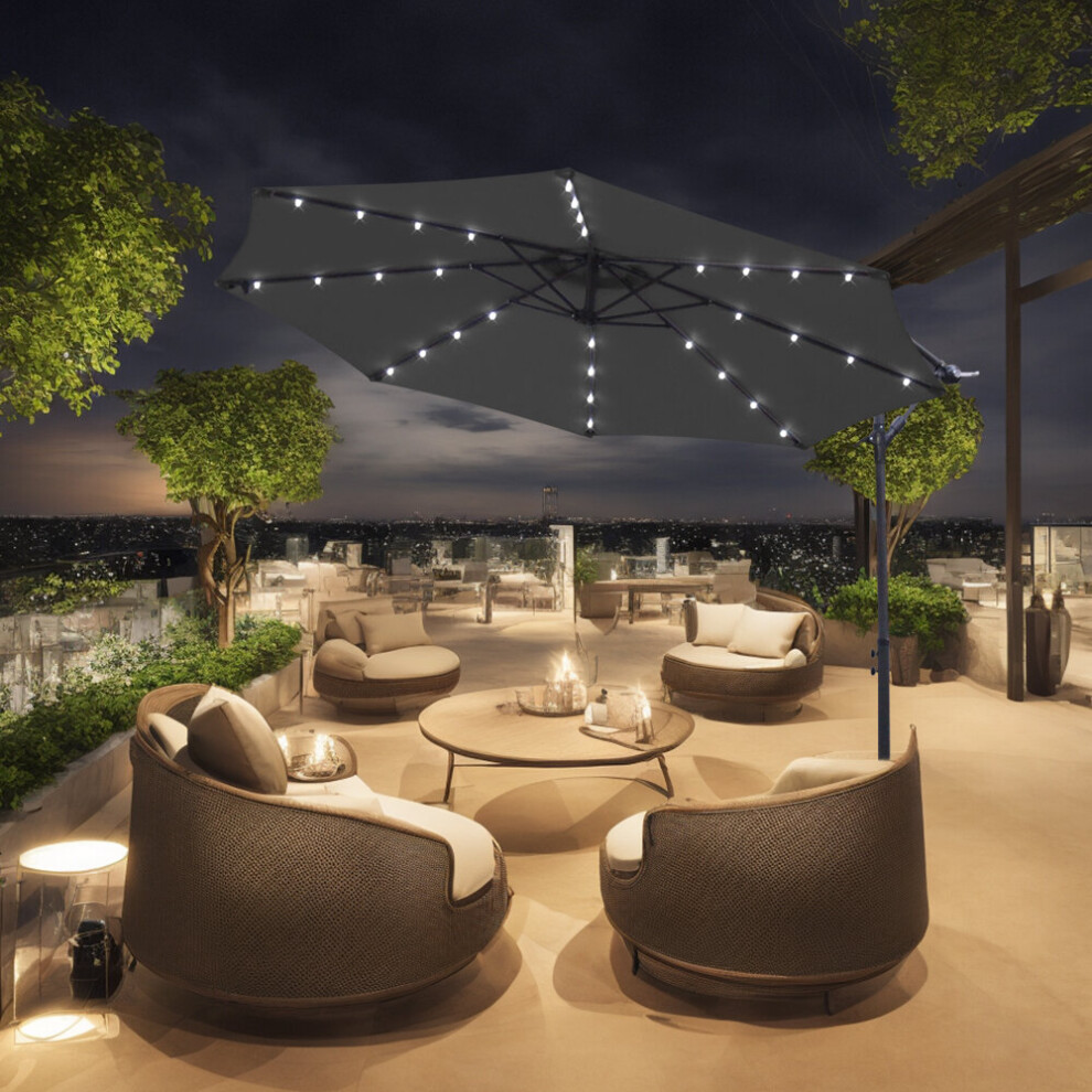 Harrier 3m Cantilever Parasol – Adjustable 3m Outdoor Patio Umbrella, Weather-Resistant Canopy | Optional LED Solar Lights & Bases [5 Colours] (Grey - LED Lights, 4x Bases With Cover)