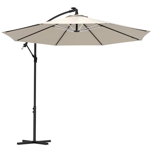 Outsunny 3(m) Banana Cantilever Parasol with Solar LED Lights, Garden Umbrella with Cross Base and Crank Handle, Hanging Offset Sun Shade for Outdoor, Patio, Beige