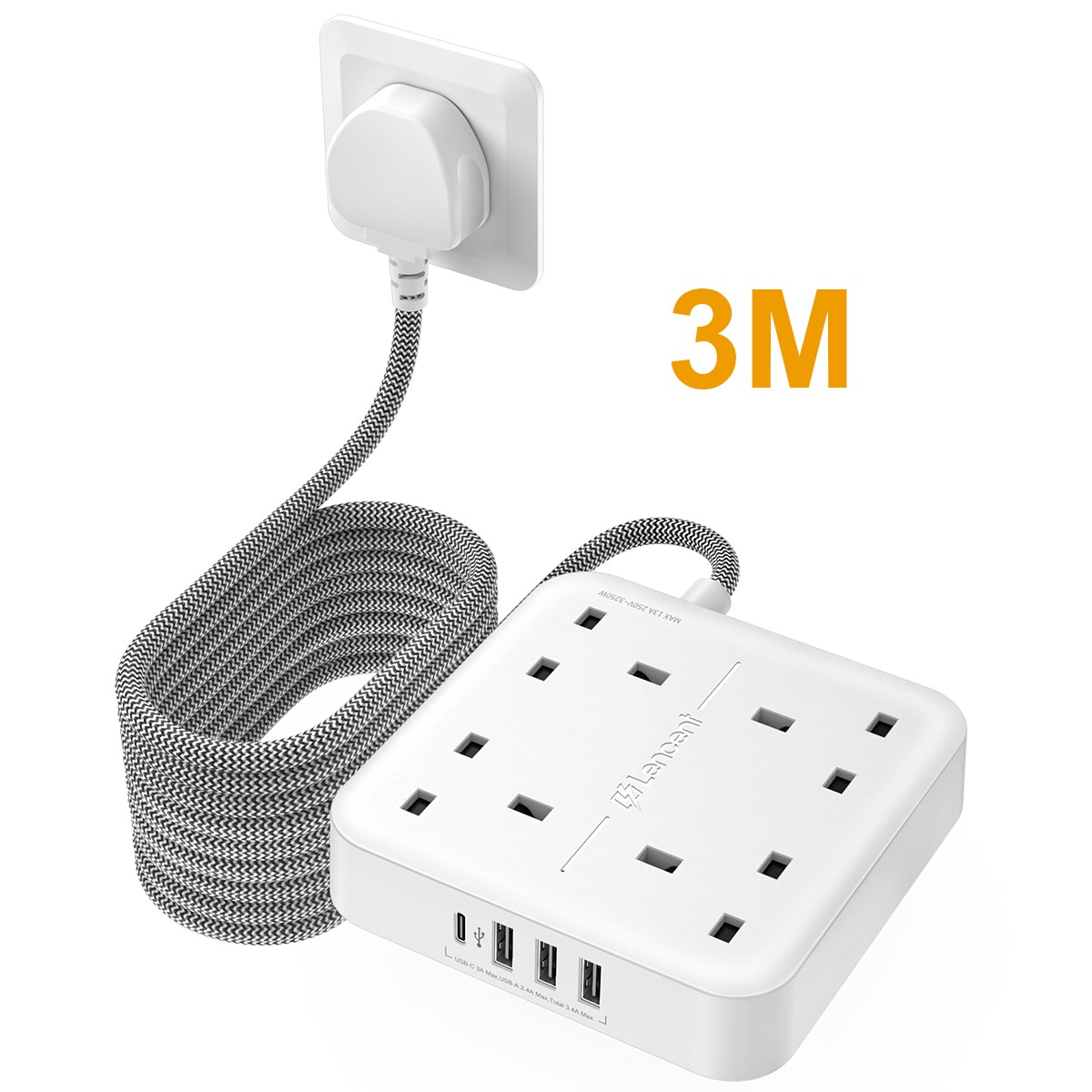 LENCENT 3M Extension Lead 4 Way Outlets Power Strip w/ 1 USB C 3 USB Ports 3250W