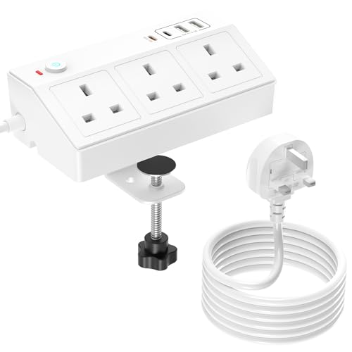 3M Extension Lead with 4 USB, 3 Way Multi Plug Extension Socket with 2 USB A 2 USB C, Desktop Power Extension Cable for Home Office