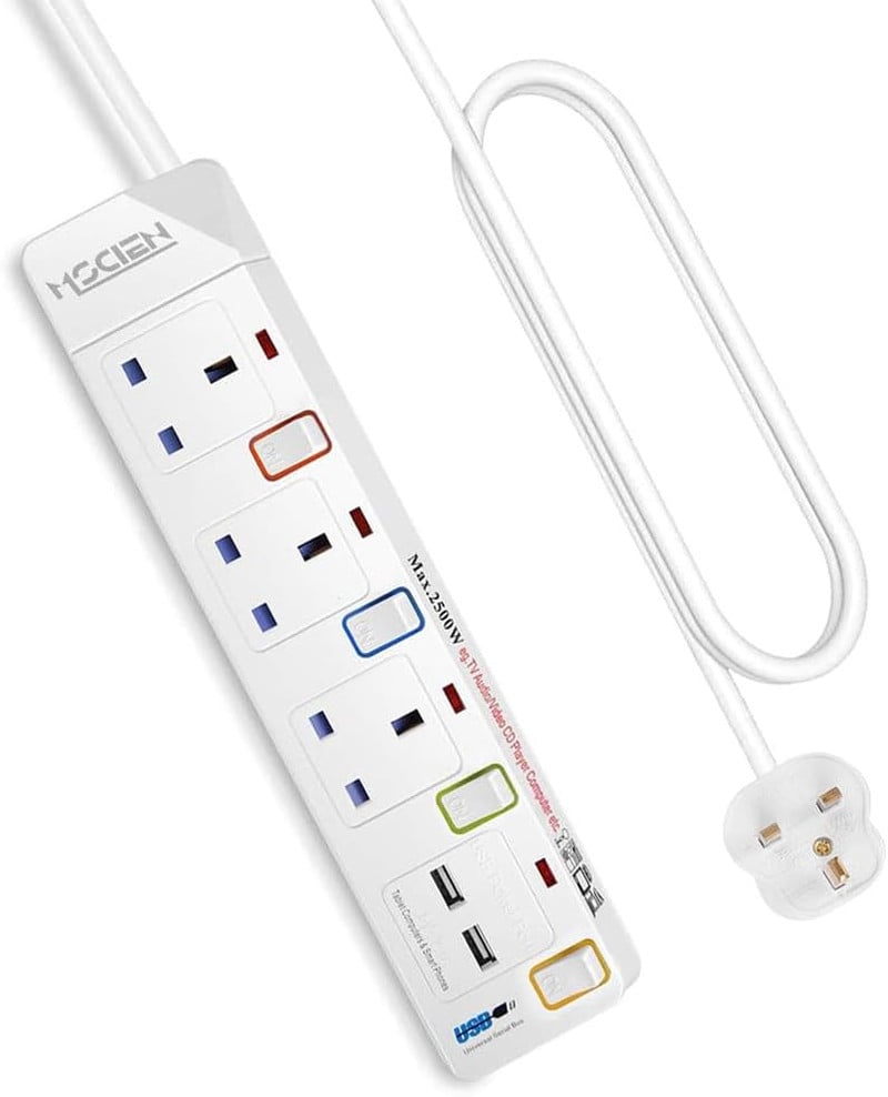 3 Way Extension Lead with 2 USB Slots, Mscien 3M Extension Lead, Multi Plug with
