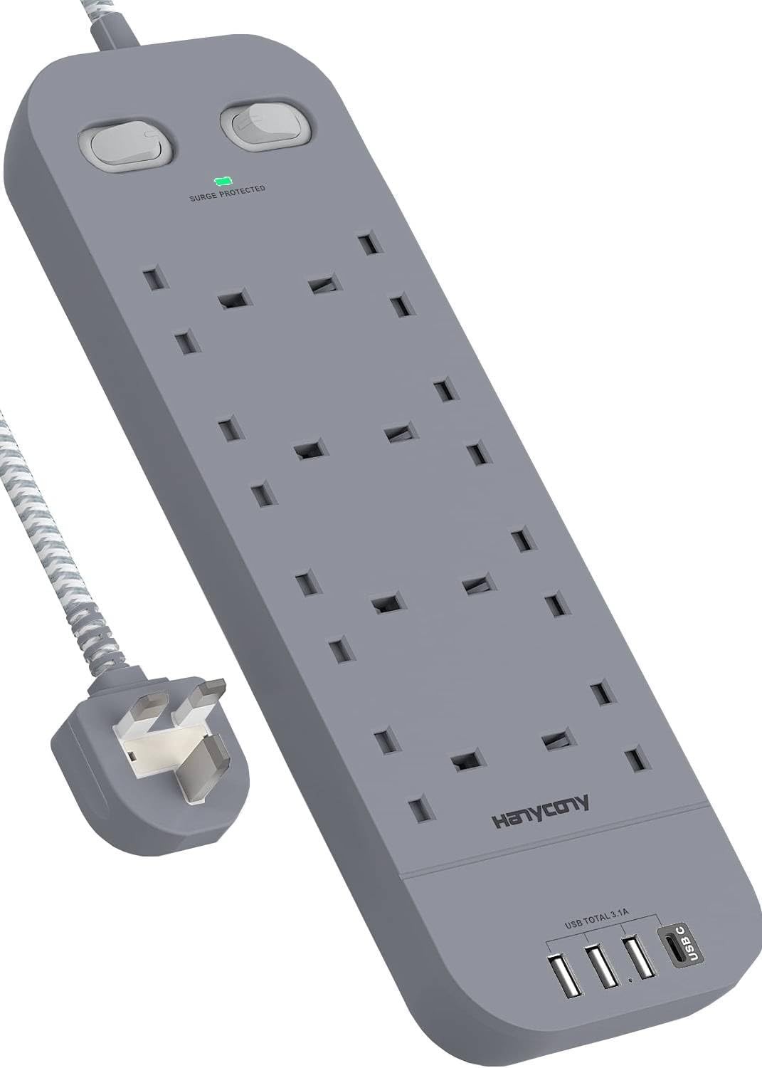 Hotimy 3M Tower Extension Lead with USB Slots, 13A 8 Way Extension Lead Surge Pr