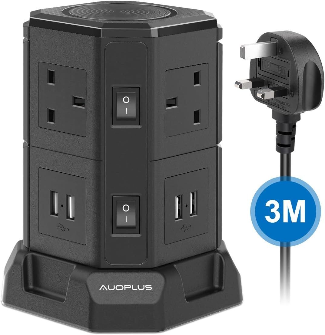 3M Tower Extension Lead with USB Solts,Auoplus 3250W 13A 6 Outlets and 4 USB Cha
