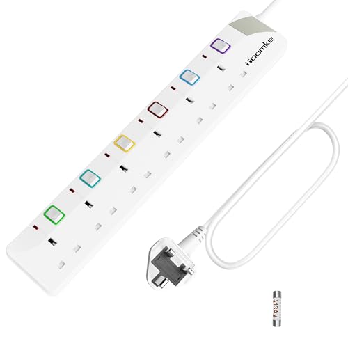 Toomke 3M Extension Lead 6 Way Multi Plug Extension Sockets with Individual Switches, 6 Plug Wall-Mounted Power Strip 3 Meter Power Cord 13A 3250W for Home Office Kitchen