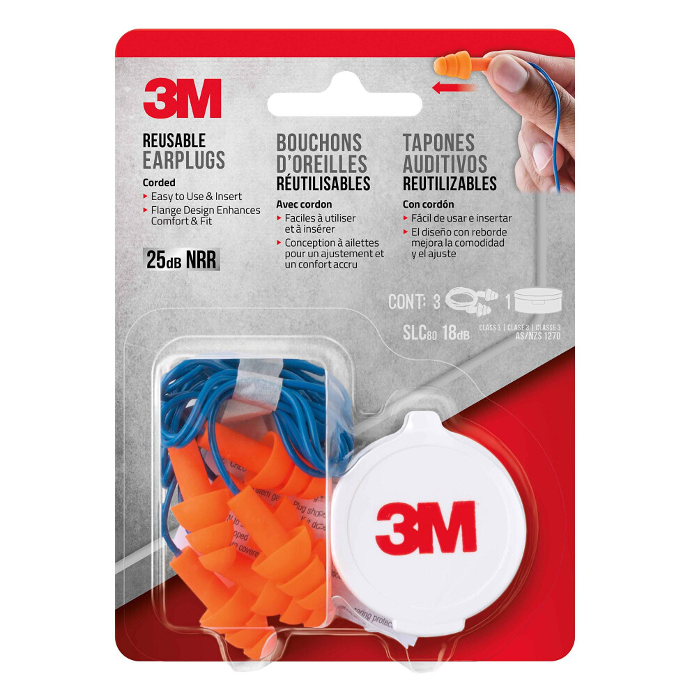 3M Corded Reusable Earplugs, 3-Pair with Case (90716-80025T)