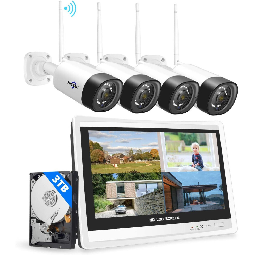 Wireless Security Camera System 12"Monitor Wireless WiFi Security CCTV System 8CH NVR Night Vision Remote Access 2-Way Audio 3.0MP 3TB HDD