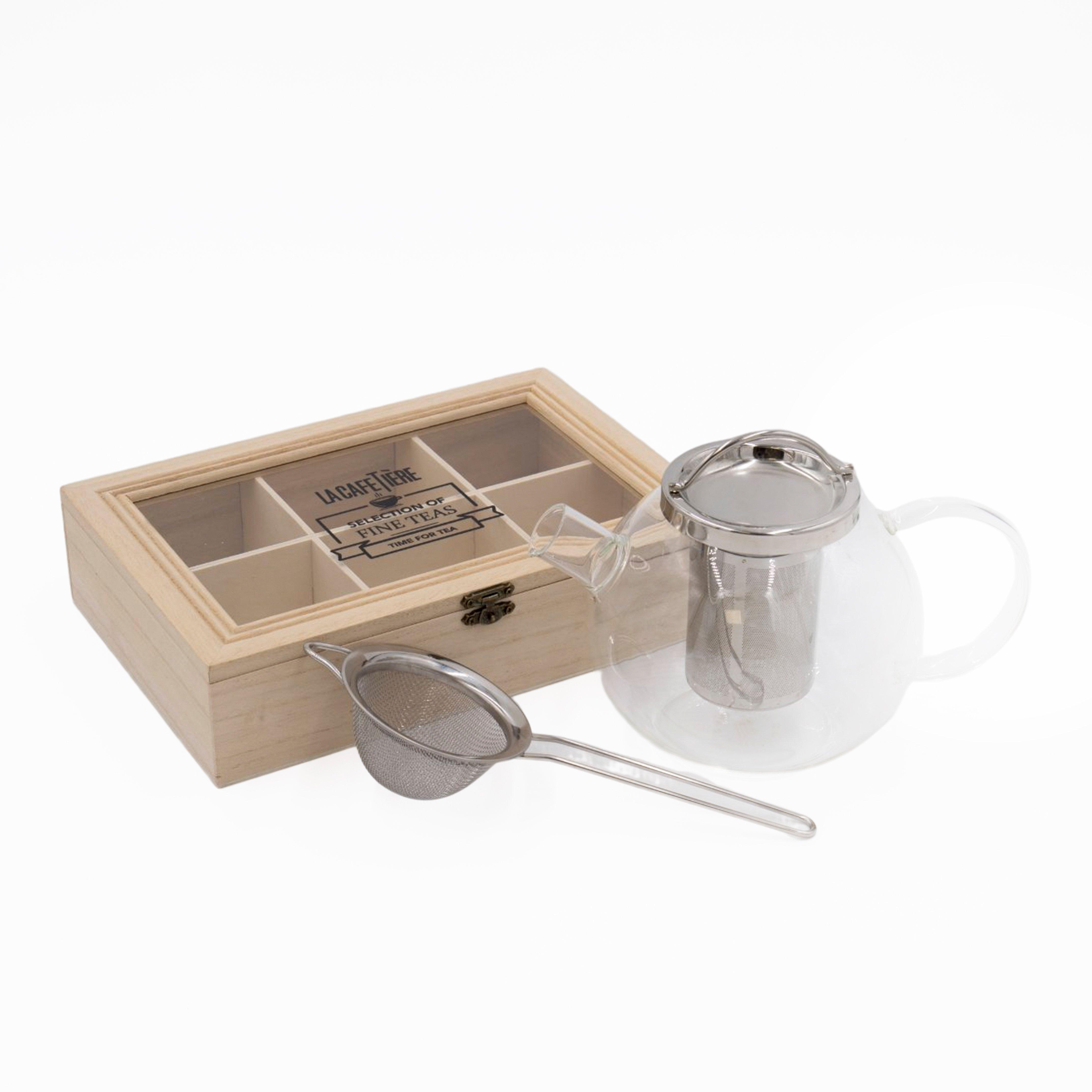 3pc Tea Set with Darjeeling 4-Cup Glass Teapot with Infuser, Tea Strainer and 6-Compartment Tea Box