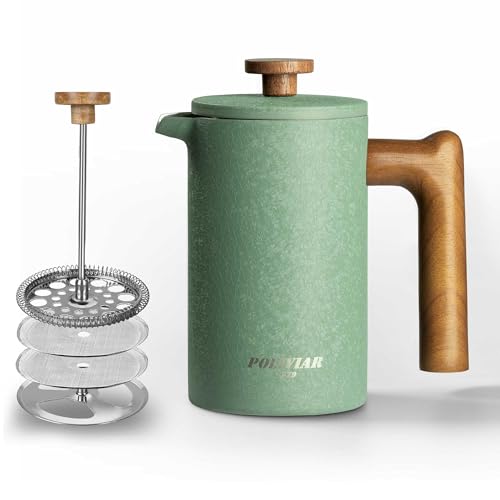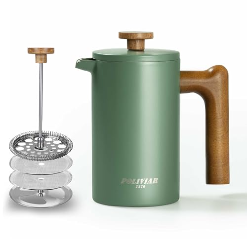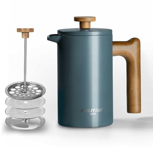 POLIVIAR Cafetiere 4 Cup, French Press Coffee Maker with Wood Handle, Double Walled Insulated Cafetiere &1 Extra Filter, Insulated 600ml French Press for Coffee & Tea, Includes 1 Extra Filter