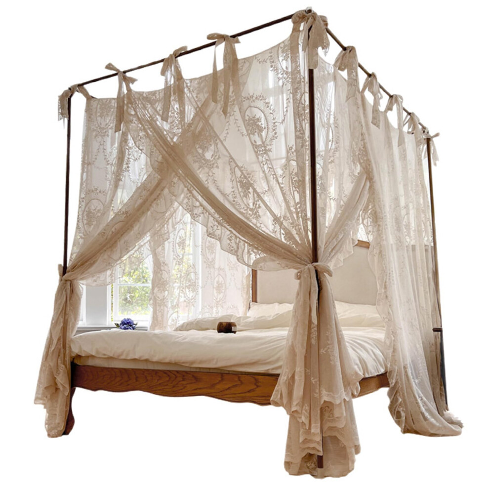 Bed Canopy 4 Corner Post Curtains, Romantic Lace Mosquito Net For 1.5m (4.92ft) Beds, Beige, Frame Not Included