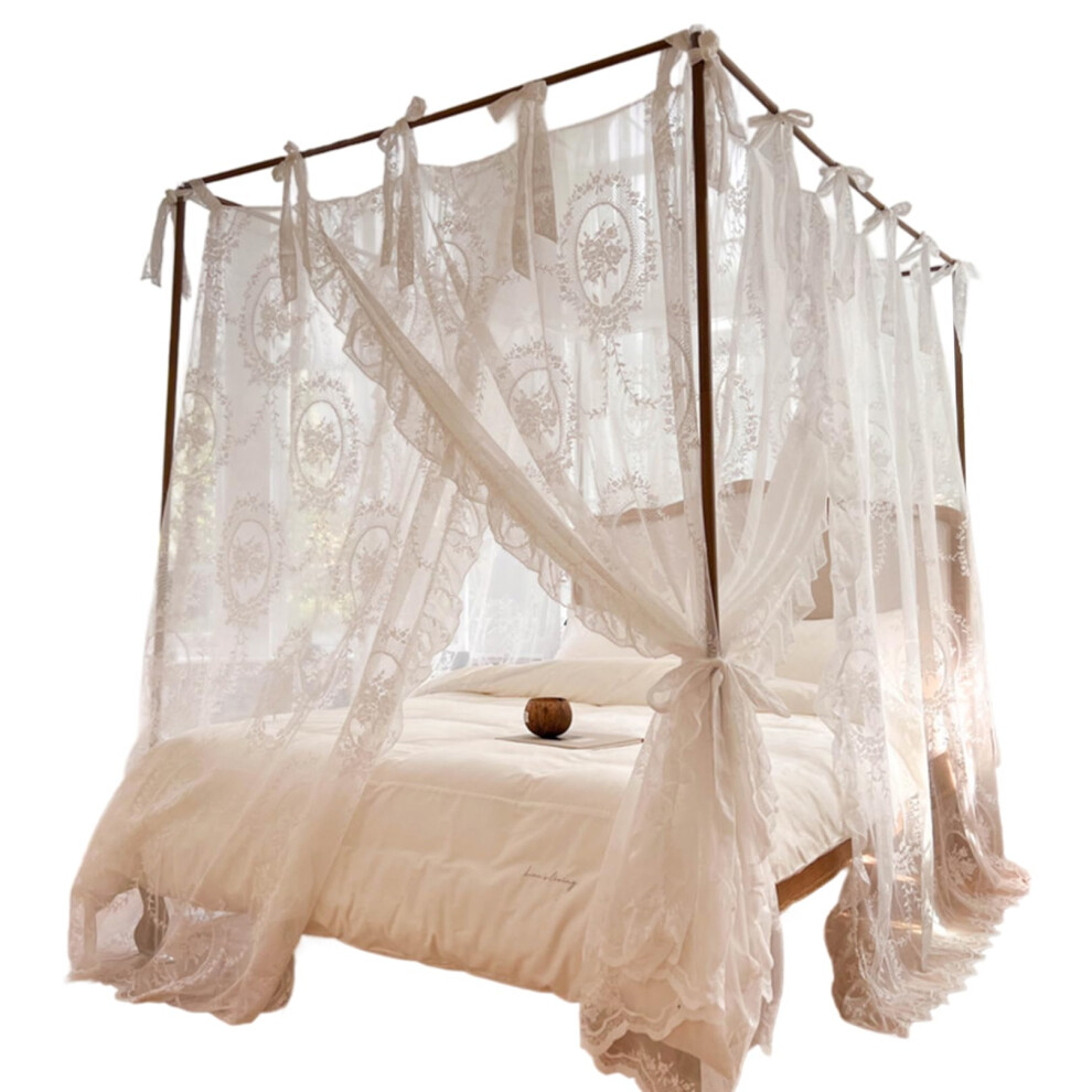 Canopy Bed Curtains, Lace Princess Canopy with Three Openings, 4 Corner Post Hanging Drapes, Fits 4.92ft Beds