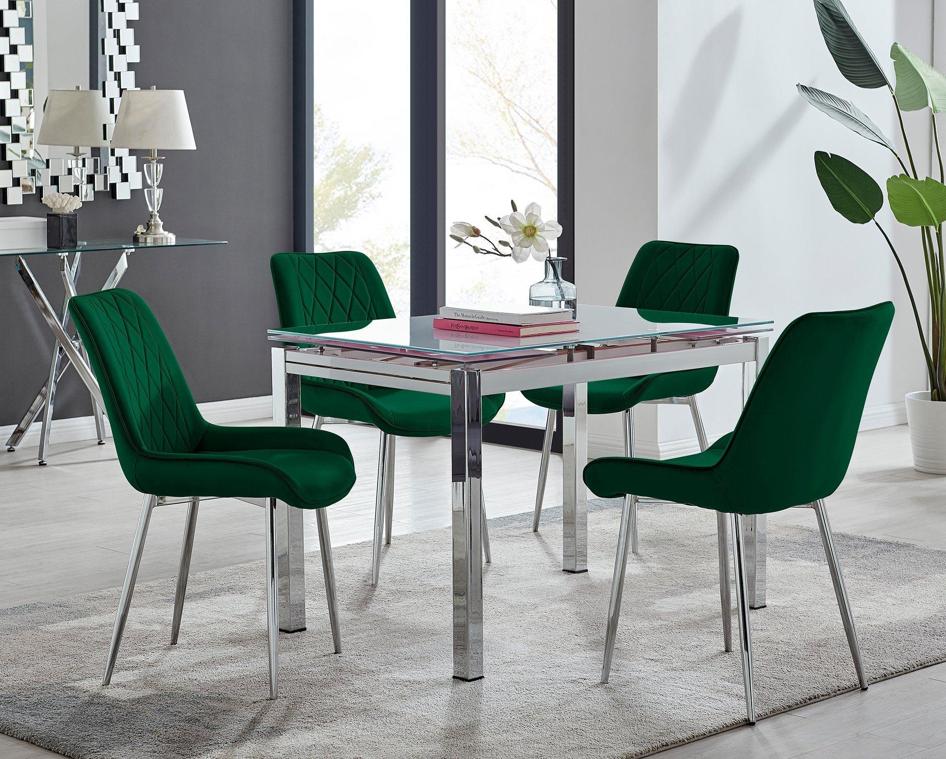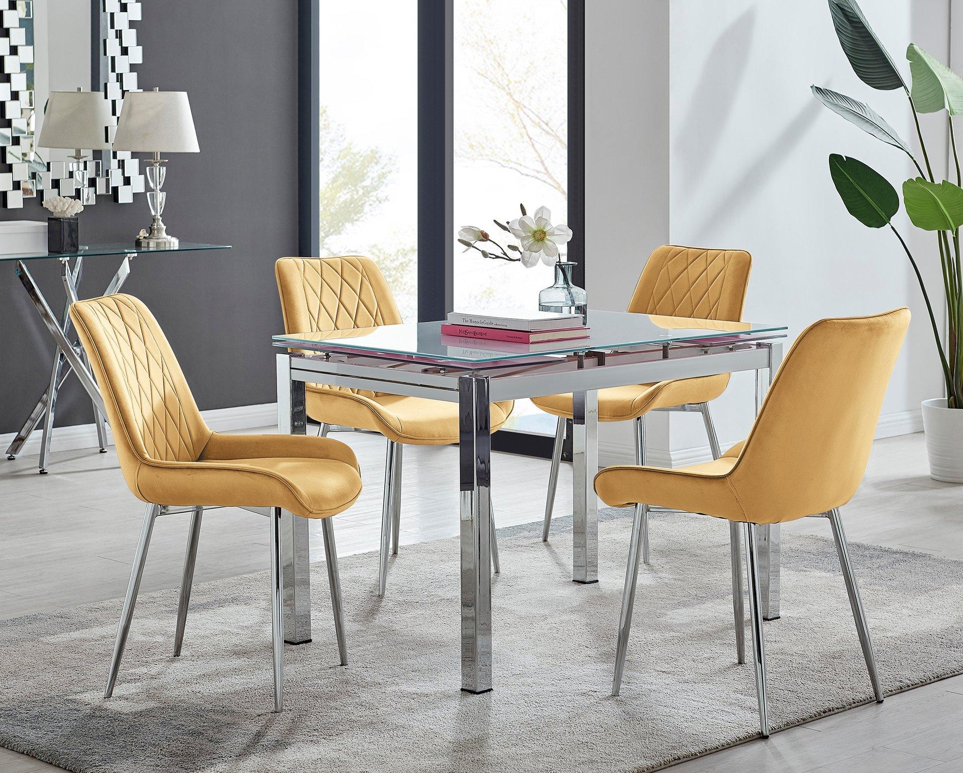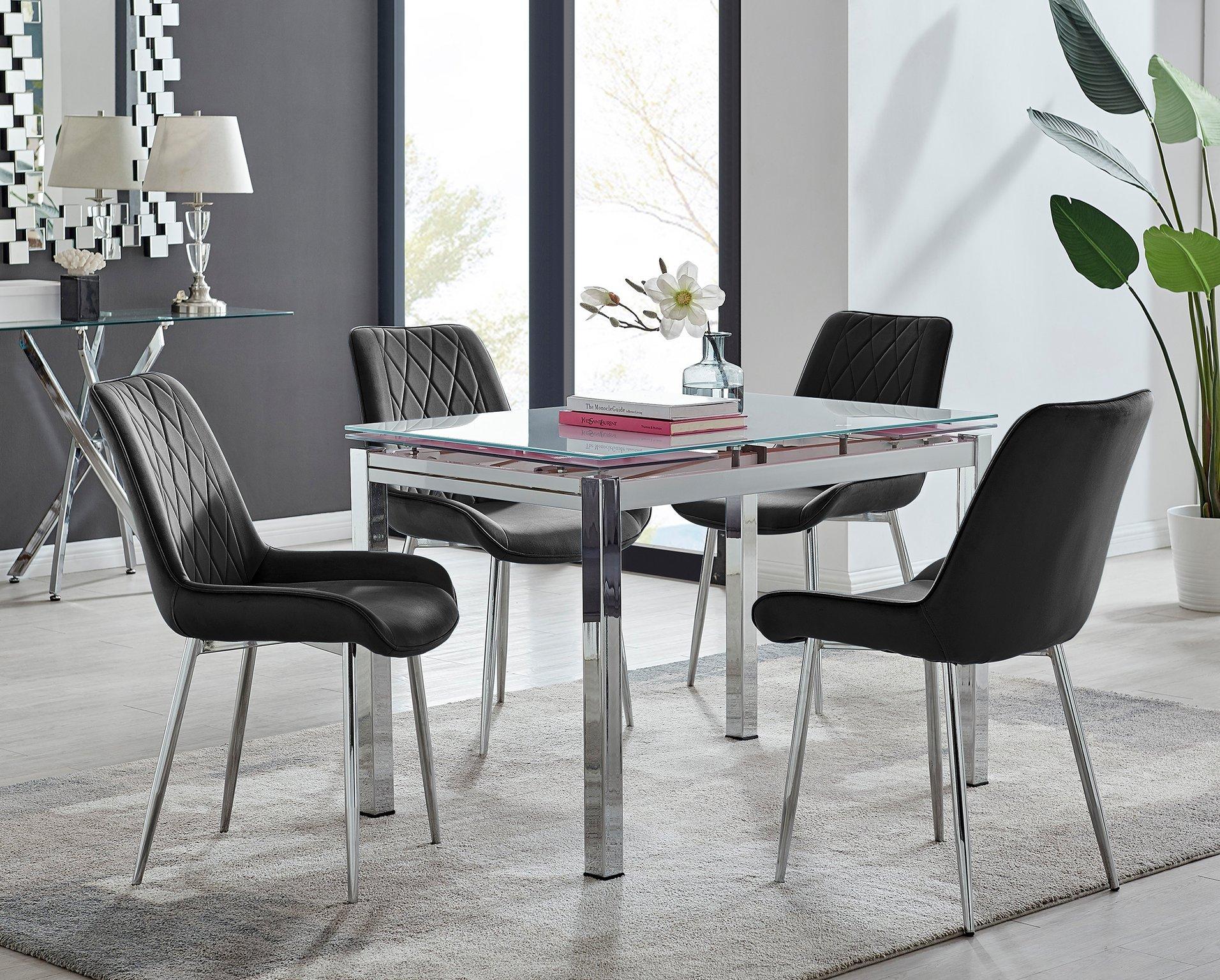 Enna White Glass Extending 4-6 Seater Dining Table and 4 Pesaro Soft Velvet Chairs