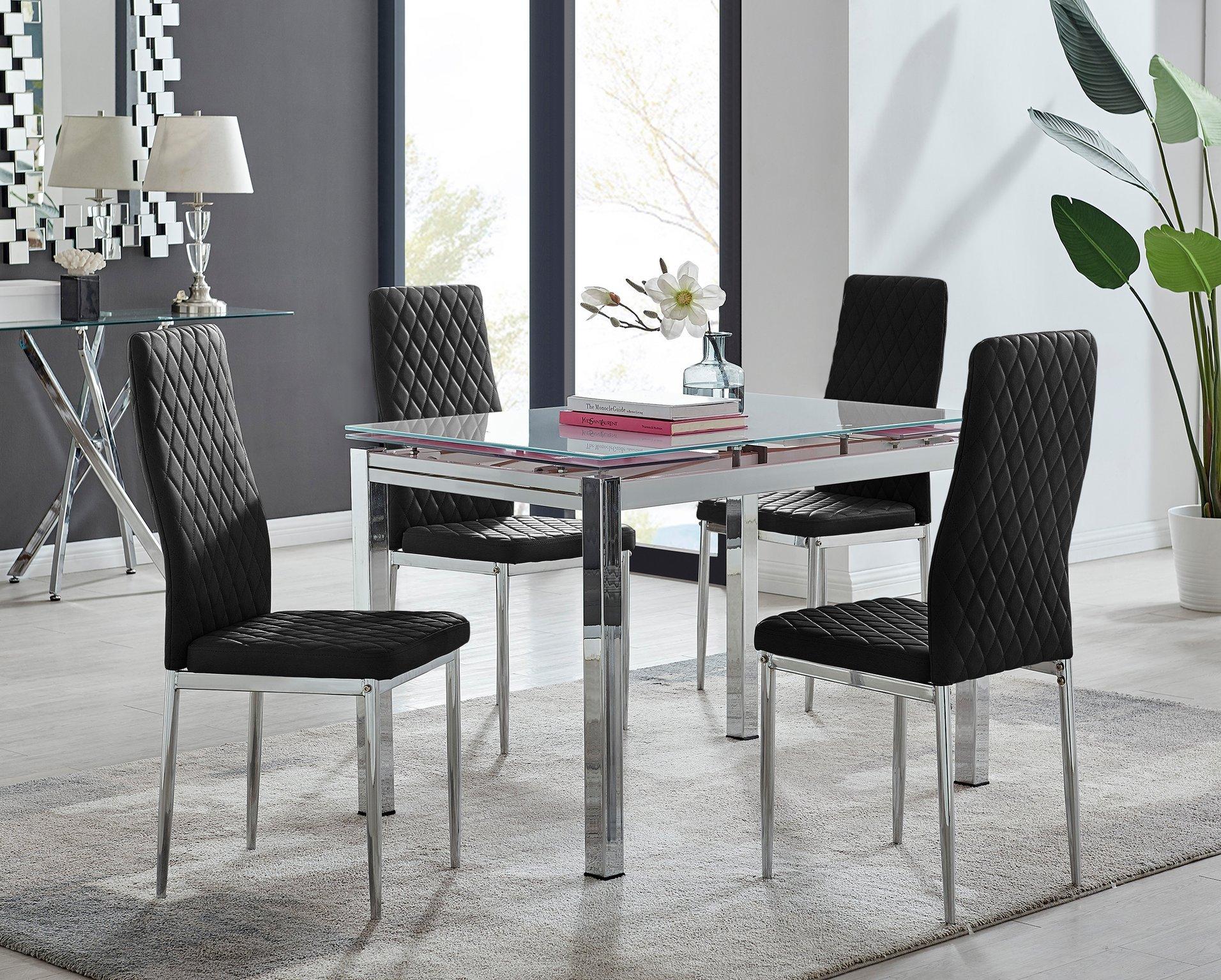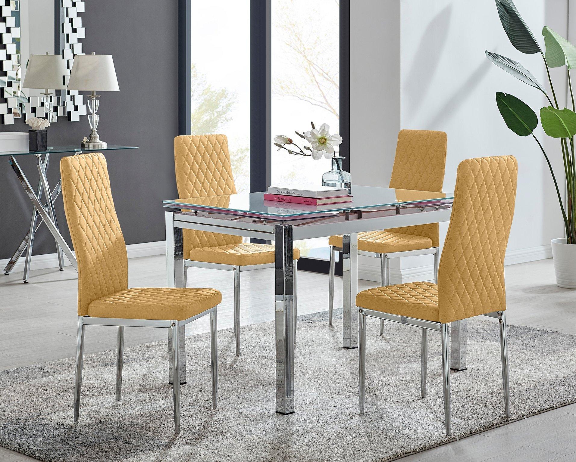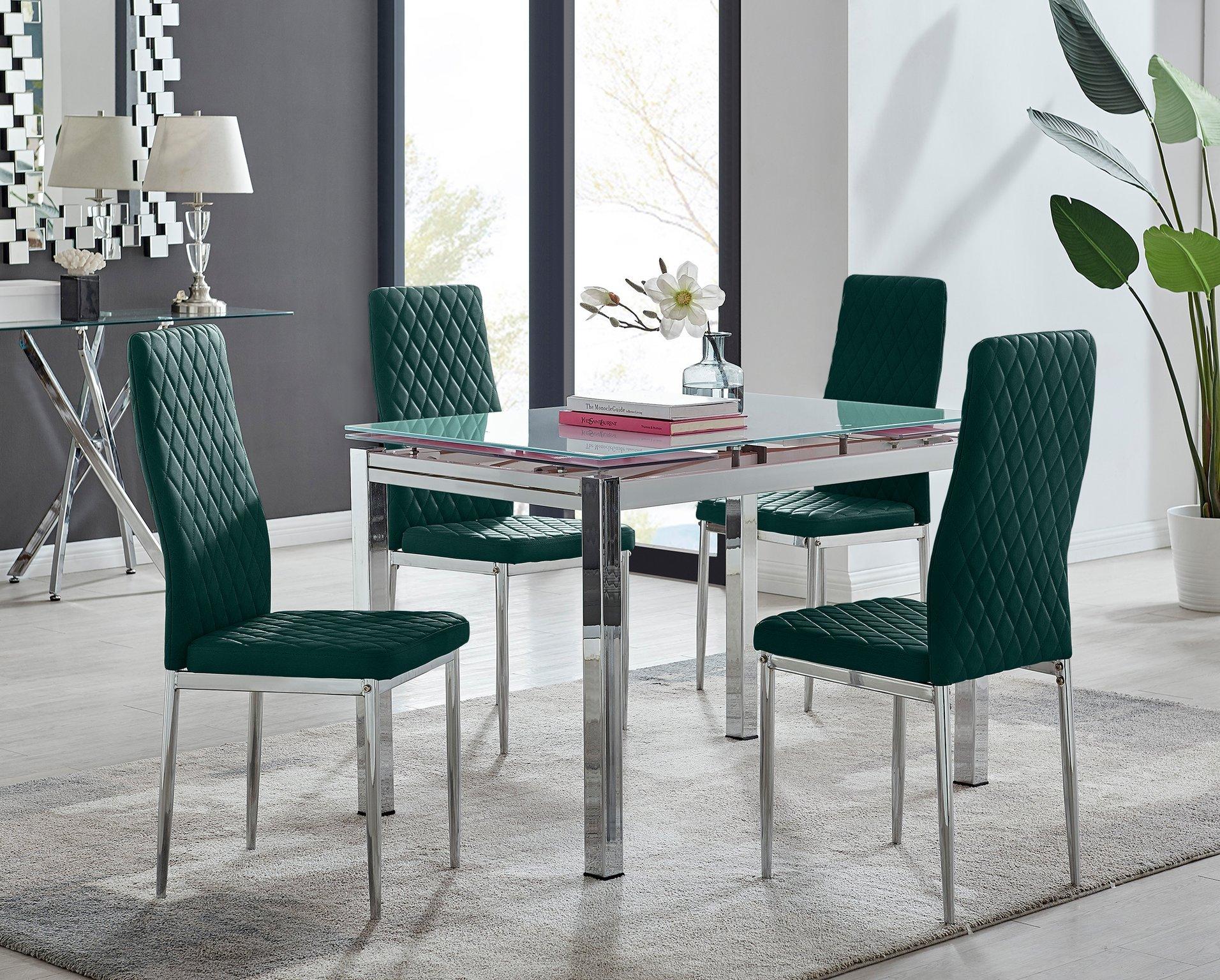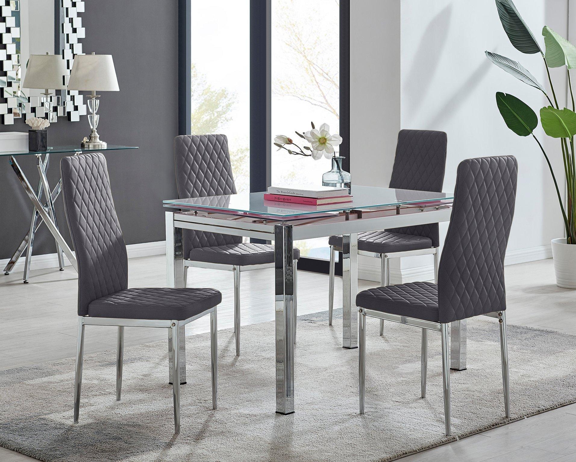 Enna White Glass Extending 4-6 Seater Dining Table and 4 Pesaro Soft Velvet Chairs